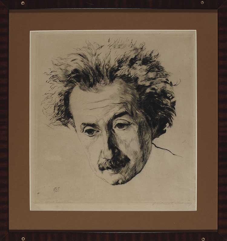 Impressive and highly-detailed original vintage drypoint print of Einstein, by artist Julius C. Turner, 13.5 x 14.75, signed along the bottom edge in pencil, “Albert Einstein,” and also signed in pencil by the artist, Julius C. Turner. Matted and framed to an overall size of 18.5 x 20. In fine condition, with a bit of scattered light soiling.