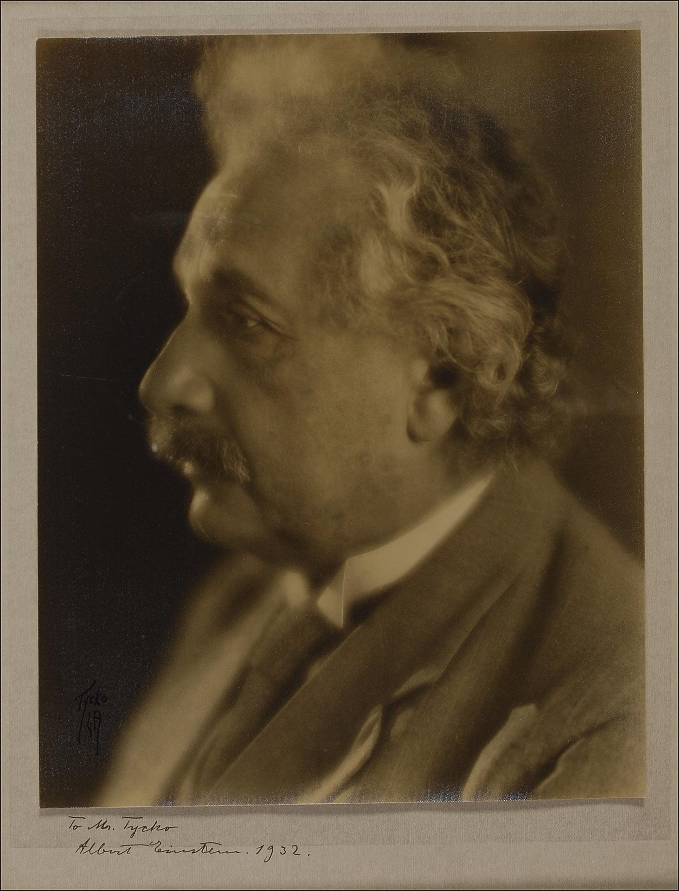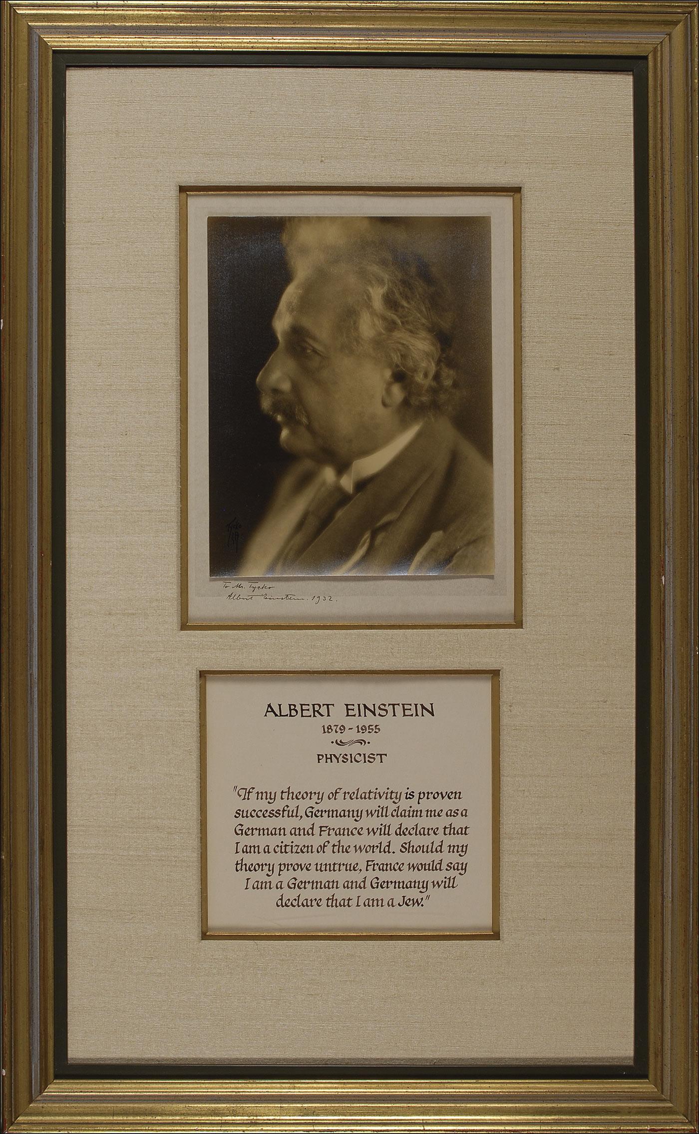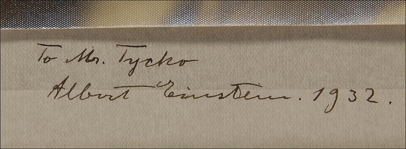 Striking 7.25 x 9 profile photo of Einstein on its original 8.25 x 11 mount, signed on the image in ink by the photographer “Tycko, L.A.” and signed and inscribed on the mount by Einstein, “To Mr. Tycko, Albert Einstein, 1932.” Cloth matted and framed with a calligraphic quotation to an overall size of 17.75 x 28.75. Little has been documented of Tycko’s photography career, though he is known to have photographed a number of entertainment personalities in the Los Angeles area in the early decades of the 20th century. More startling, however, is his reported role in pegging Einstein as a Communist, as described in the 1993 book The Einstein File: J. Edgar Hoover’s Secret War Against the World’s Most Famous Scientist by Fred Jerome. In a characteristic display of paranoia, infamous FBI Director J. Edgar Hoover instituted a massive effort to collect “derogatory information” on Einstein from the time of the scientist’s permanent residence in America in 1933 until his death in 1955. According to an informant in the film industry (whose reliability, it must be added, was called into question), Tycko once described Einstein as “the brain that was setting up Hollywood in the 1930s for the big Communist push...He was one of the most dangerous and powerful figures in what has become the Communist movement.” Mild silvering to perimeter of image, otherwise fine, clean condition. A splendid example with a most unusual association! Oversized. Pre-certified John Reznikoff/PSA/DNA and RRAuction COA.