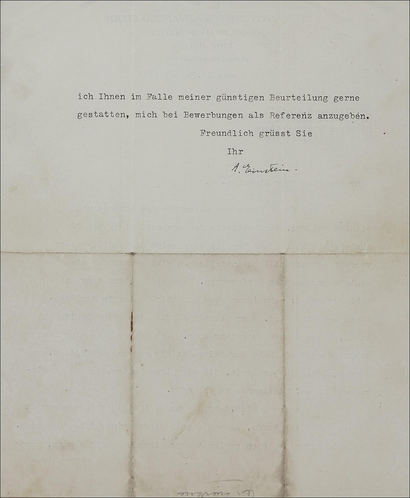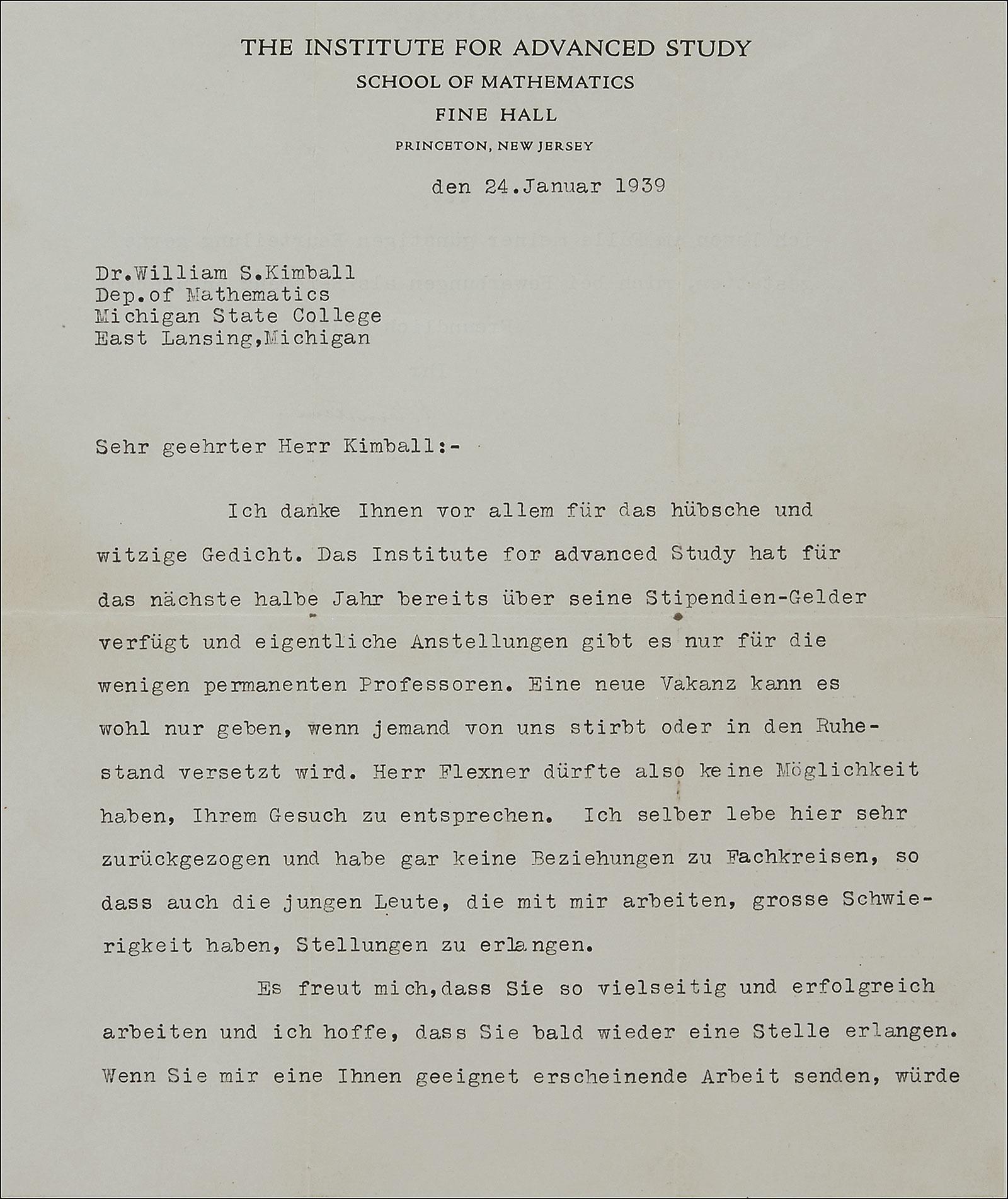 TLS in German, signed “A. Einstein,” one page both sides, 8 x 9.5, Institute For Advanced Study letterhead, January 24, 1939. Letter to Dr. William S. Kimball of the Mathematics Department of Michigan State University. In full: “First of all I want to thank you for the neat and witty poem. The Institute for Advanced Study has already disbursed all the scholarship funds available for the next half year. Actual positions exist only for the few permanent professors. A new opening could only be expected to occur if one of us should die or retire. Mr. Flexner therefore won’t be able to meet your request. Personally, I am living here in quite secluded circumstances and have practically no connections to the scientific community. Consequently, the young people working with me also have much difficulty lining up job opportunities for themselves.