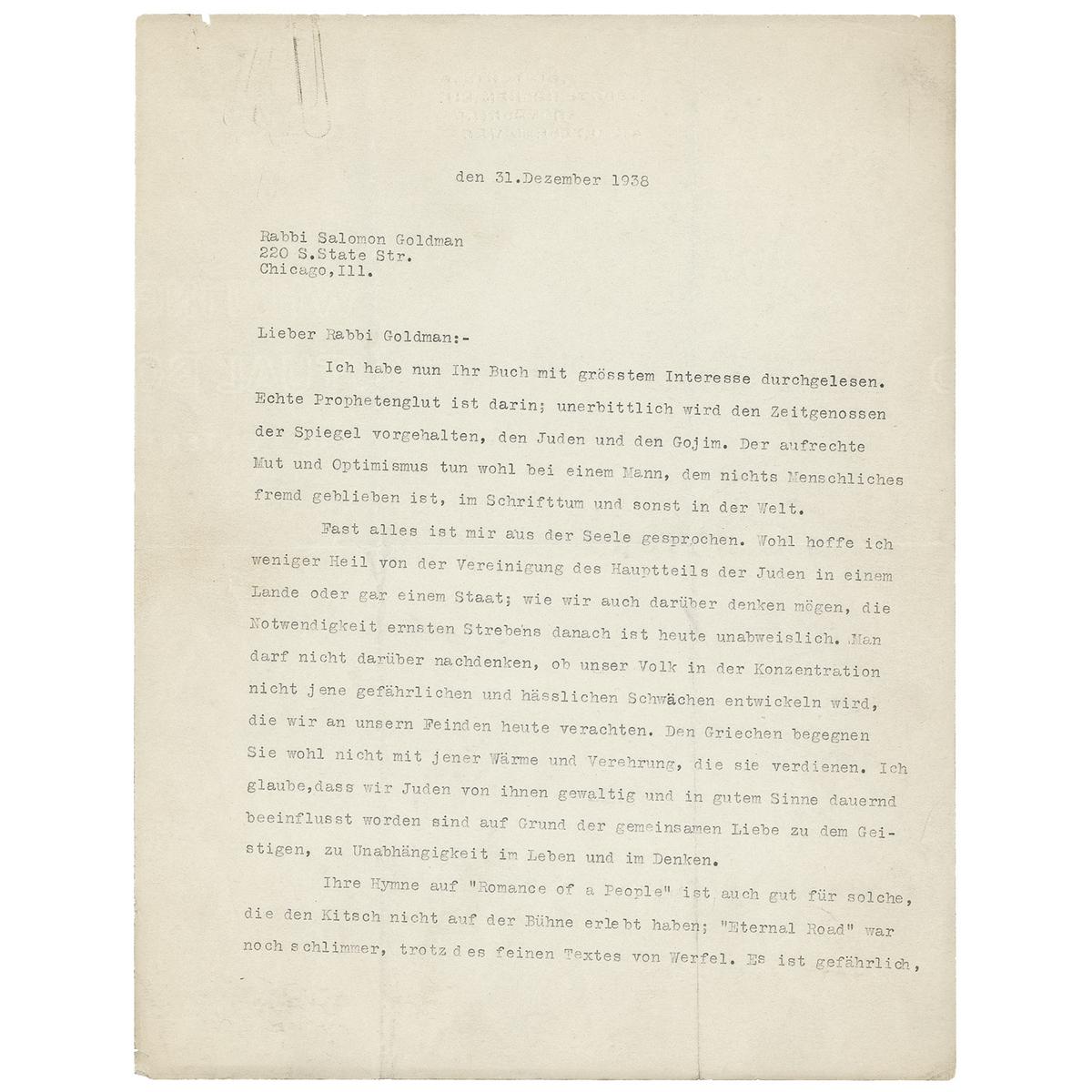 TLS in German, signed “A. Einstein,” two pages, 8.5 x 11, blind-stamped personal letterhead, Princeton, New Jersey, December 31, 1938. Letter to Rabbi Salomon Goldman, president of the Zionist Organization of America. In full (translated): “I have just read your book with the greatest interest. It contains the true fire of a prophet; it mercilessly holds a mirror up to the contemporaries, Jews and Goyim alike. Your upright courage and optimism are a pleasure to behold in a man to whom nothing human remains foreign, not in scripture and not in world otherwise. Almost everything is spoken from my soul. I admit that I entertain lesser hopes for salvation through a union of the majority of Jews in a single country or even a state; no matter how we may think about this, the necessity of earnest striving for such a solution today is unavoidable. One must not deliberate whether our people in concentration would perhaps develop those dangerous and hideous weaknesses which we despise in our enemies today.