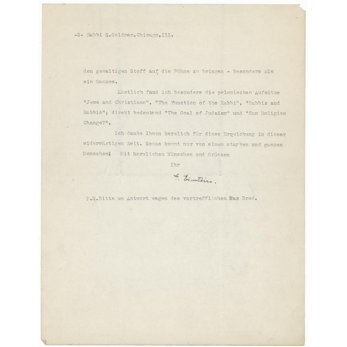 I feel you do not afford the Greeks the friendliness and veneration which they deserve. I believe that we Jews have been strongly and continuously influenced by them in a positive sense due to our common love for the spiritual world, for independence in life and in thought. Your hymn to ‘Romance of a People’ is also good for those who have not witnessed that kitsch on stage; ‘Eternal Road’ was worse still, in spite of Werfel’s fine text. It is dangerous to transfer this great matter to the stage – especially as a whole. I particularly enjoyed the polemical articles ‘Jews and Christians,’ ‘The Function of the Rabbi,’ ‘Rabbis and Rabbis’; of immediate importance were ‘The Goal of Judaism’ and ‘Can Religion Change!’” Einstein also adds a brief unsigned postscript, “P. S. I beg an answer regarding the excellent Max Brod.” Intersecting folds, one affecting the tops of a couple letters of signature, paperclip impressions to top edges, and some light edge wrinkling and soiling, otherwise fine condition.
