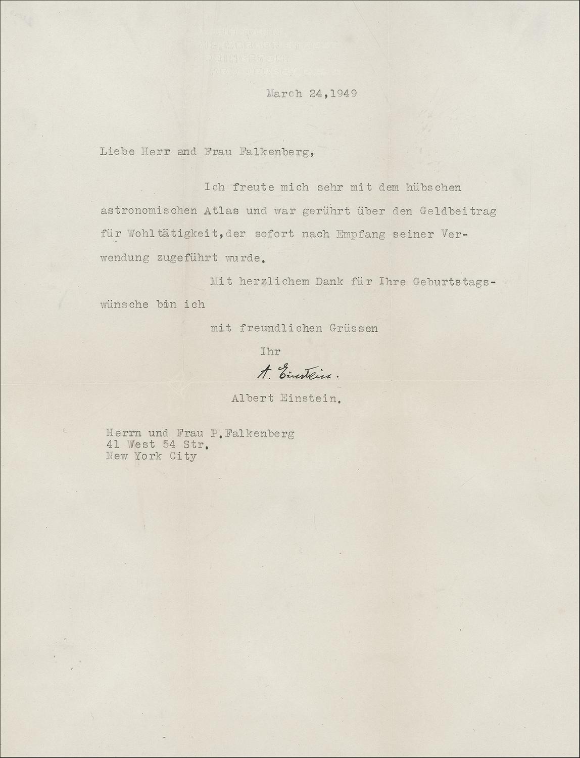 TLS in German, signed “A. Einstein,” one page, 8.5 x 11, blind-stamped personal letterhead, March 24, 1949. Letter to Mr. And Mrs. Paul Falkenberg. In full (translated): “I was very pleased to receive the pretty astronomic atlas and indeed touched by the money you sent for charitable purposes. On receipt, the funds were immediately directed towards the intended use. Thanking you from the bottom of my heart for your birthday wishes, I remain with best regards.” In fine condition, with intersecting mailing folds, and a hint of trivial toning. Accompanied by the original mailing envelope. One can imagine Einstein was inundated with gifts relating to space over his years given his monumental work.