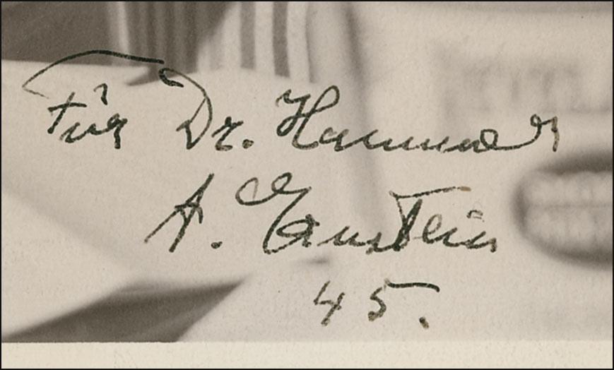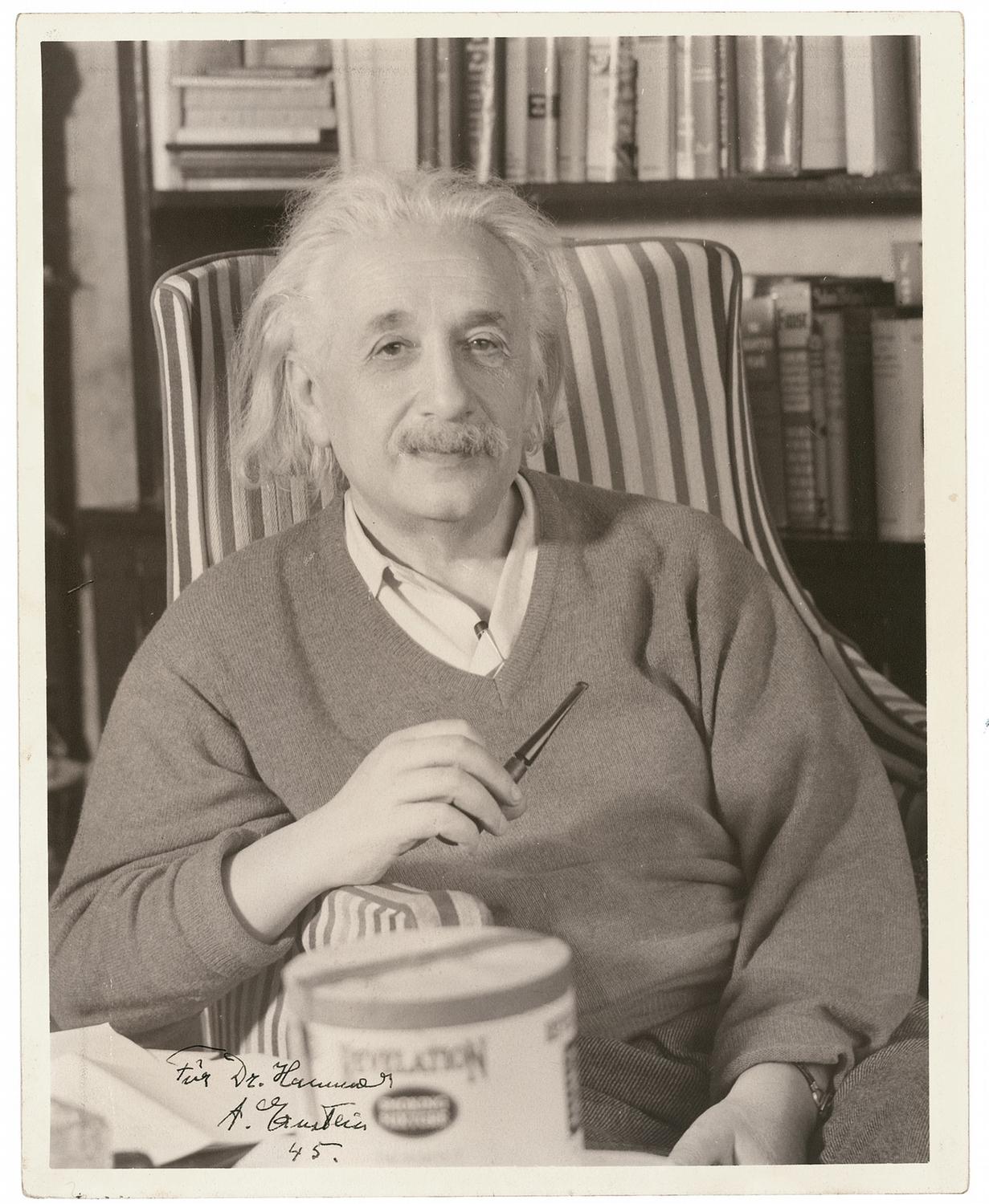 Spectacular and compelling vintage matte-finish 8 x 10 photo of Einstein relaxing in his study with his pipe, signed and inscribed in black ink “Für Dr. Haussner, A. Einstein 45.” Notations written in another hand on reverse read, “Dr. Albert Einstein, Princeton. Feb. 1945. Photo by Alan W. Richards, Palmer Lab, Princeton, N. J.” In fine condition, with some very subtle edge toning, trivial surface mark to background at left edge, and adhesive residue to reverse. The Palmer Physical Laboratory was finished in 1908 and was originally the Physics Department’s classrooms and offices. Einstein once lectured in this academic hall, which was designed more for utility than for looks. In 2000, Palmer was renamed the Frist Campus Center after it was renovated and enlarged with money from the family of Senator Bill Frist. Alan W. Richards came to work as a photographer at Princeton in the 1940s, and was active through the 1960s. Present at almost every University event, Richards’ photographs in the university archives document the life of the university community.