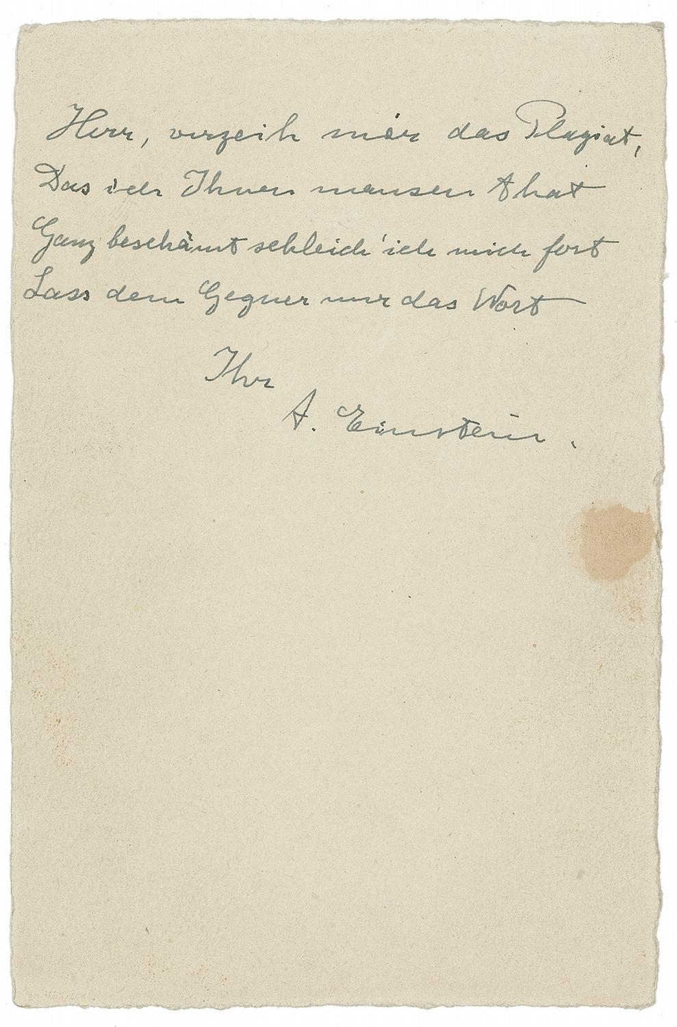 Amazing AQS, in German, signed “A. Einstein,” on the reverse of a pre-printed 4.5 x 7 thank-you card to his 50th-birthday felicitators dated March 14, 1929. Einstein writes (translated): “My plagiarism pray forgive, I cribbed from you, I will admit, Full of shame aside I go, And surrender to my foe.” Printed side of the notation reads (translated): “Each of you is showing me today, The very best side of themselves. And dear ones from near and far, Have written touching words to me. And presented me with everything, Only a gourmet could think of. Anything that might be pleasing To a man getting on in years. Everyone is approaching with sweet tunes, Just to make my day more beautiful. Even the countless cheapskates among them, Are designating their lyric poems to me. Giving me feelings of exaltation, Like the proud eagle has. As the day is drawing to an end, I shall hasten to give you my compliments. You all did very well, And our dear sun keeps on smiling.” In fine condition, with small spot of staining to the right edge (easily matted out if so desired), as well as several spots to printed side. Upon reaching his 50th year, Einstein here exhibits a profound understanding of aging. He had expressed a desire to let his birthday pass without notice, yet the press hounded him as the date approached. Rather than partake of a celebration he chose to sneak away and spend time alone in the country, then returned home to dinner with his wife and children. Even so, Einstein’s birthday garnered good wishes from across the world. His friends purchased him a sailboat, and Zionists in the United States purchased a plot of land in Palestine and planted it with trees in his honor. For all those who showed the great scientist “the very best side of themselves,” Einstein here expresses his gratitude for “giving me feelings of exaltation.”