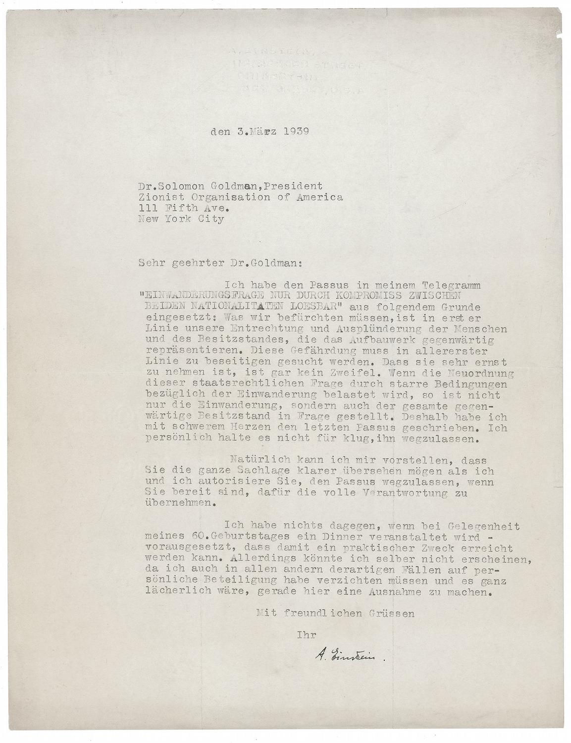 TLS in German, signed “A. Einstein,” one page, 8.5 x 11, blind-stamped personal letterhead, March 3, 1939. Letter to Solomon Goldman, president of the Zionist Organization of America. In full (translated): “In my telegram, I added the passage ‘IMMIGRATION ISSUE SOLVABLE ONLY BY COMPROMISE BETWEEN BOTH NATIONALITIES’ for the following reason: what we must fear, principally, is disenfranchising and plundering the people and classes who currently represent the construction efforts. This danger must be sought to be avoided first and foremost. That it is a serious one is beyond doubt. If the revision of this constitutional issue is burdened by inflexible constraints regarding immigration, then this threatens not only immigration, but also the entire current wealthy class. This is why with heavy heart I wrote the last passage. Personally, I do not think it wise to omit it. Of course I see the possibility that you have a clearer view of the situation, and I authorize you to omit the passage if you are prepared to take full responsibility. I have no objection to a dinner being held for my 60th birthday–provided that a practical end can be reached by it. However, I will not be able to appear in person, as I have had to abstain from appearing in other very similar cases and it would be ludicrous to make an exception on this of all occasions.” In fine condition, with intersecting mailing folds, a few edge dings, and a mild shade of overall toning. Written only six months before the start of World War II, Einstein’s references here pertain to a still-ongoing conflict between Arabs and Jews. In 1939, British authorities brought together Arab and Jewish delegations at what became known as the St. James Conference to work out a compromise between the two sides in Palestine. Facing the looming war with Germany, Britain was eager to quell Palestinian Arab and offered to cap immigration to assure Jews would always be a minority. Each delegation, however, faced their own internal differences, with the Arab representatives ultimately refusing to meet with Jewish party. Despite Einstein’s reference to his telegram that the immigration issue be solved only through compromise, not even he could devise a plan on which all sides could agree. In his continuing efforts, however, Einstein took to the radio less than three weeks after sending this letter to implore ‘American Jews and all who believe in humanity and justice’ to assist persecuted Jews in Central Europe—6,000,000 of whom would die at the hands of the Nazis during World War II. Letters such as this always provide an insightful look in the scientist’s great commitment to the Jewish people.