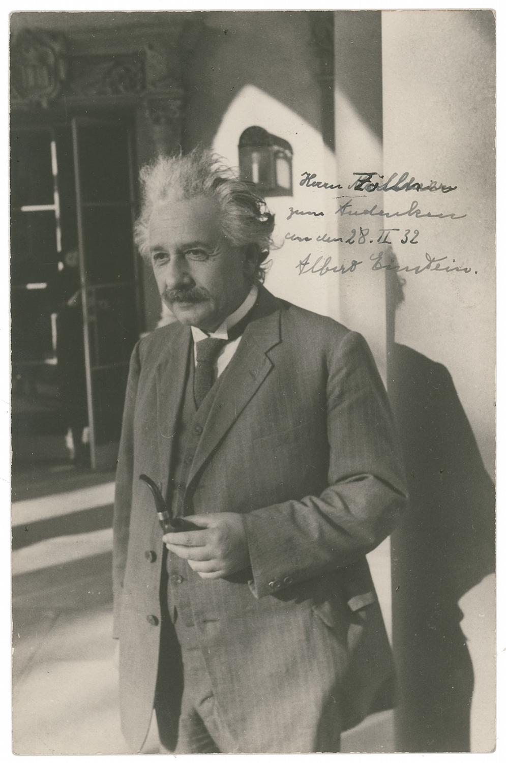 Casual vintage matte-finish 4.5 x 7 photo of Einstein holding a pipe, signed and inscribed in fountain pen in German (translated), “Mr. Zoellner, In remembrance of 2/28/32, Albert Einstein.” In fine condition, with slight lower left corner bend, faint edge wear, and Einstein inexplicably writing Zoellner’s last name over that of another recipient. Violinist Joseph Zoellner was the founding member of the Zoellner Quartet, famous for its offerings of chamber music. In January 1931, Einstein, who was in the United States for a research stay at the California Institute of Technology, paid a visit to the Zoellner Conservatory of Music in Los Angeles, and played with the famed quartet demonstrating his ability as a violinist in performing works by Mozart and Beethoven. In December 1931, after having accepted an invitation to spend the winter term at CalTech, Einstein again encountered Zoellner and presented him with this image in February 1932. Four days later, Einstein sailed home to Germany on what would be his last visit. Having returned to CalTech for a third term in December 1932, Hitler’s rise to power in January 1933 forced Einstein to cut all ties with Germany, leading to his eventual emigration to the United States. An unusual and uniquely signed example.