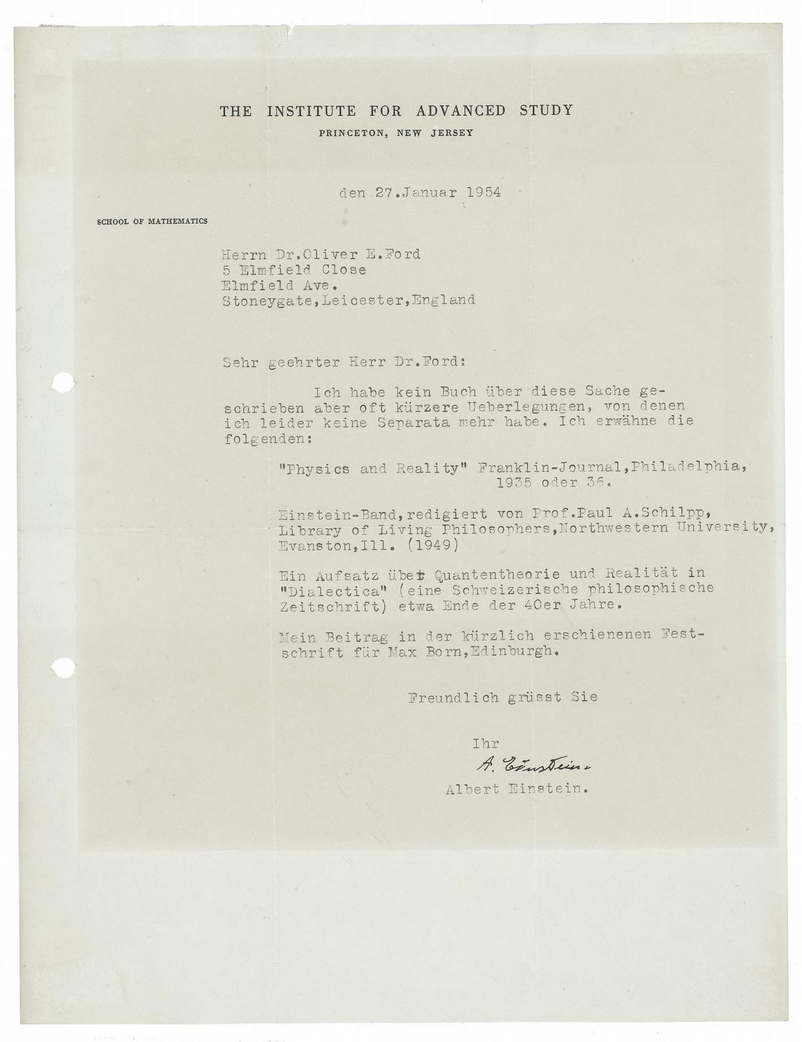 TLS in German, signed “A. Einstein,” one page, 8.5 x 11, Institute for Advanced Study letterhead, January 27, 1954. Letter to Dr. Oliver Ford in England. Einstein explains that while he has not written a book on physics, quantum theory, and reality, he has produced several shorter pieces, but has run out of off-prints. He therefore gives references for a few of his articles on the subject. In full: “I did not write a book on this subject, but did write numerous shorter reflections on it. Unfortunately, I no longer have any extra prints of these. In that connection, the following information should be helpful: