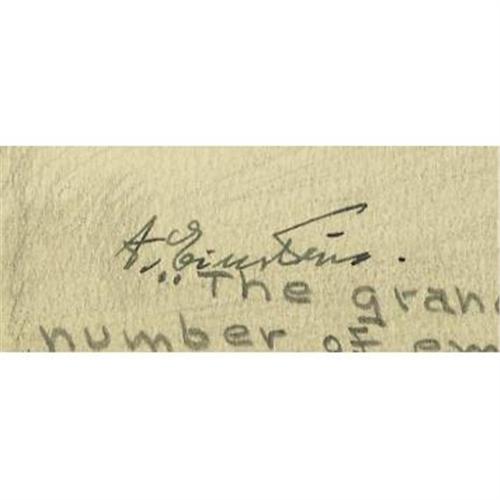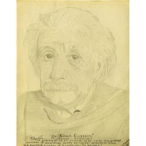 <B>Albert Einstein Portrait Signed</B></I> "<I>A. Einstein</B></I>". An original pencil sketch also signed and dated by the artist, "B. Fagan 1950", 8.5" x 11", showing the head and shoulders of the elderly genius wearing his trademark sweater. Below the portrait are lines reading "Dr. Albert Einstein (Proffessor [sic] - Scientist) The grand aim of all science is to cover the greatest number of empirical facts by logical deduction from the smallest number of hypotheses or axioms." A unique piece of Einstein memorabilia. Very fine condition.