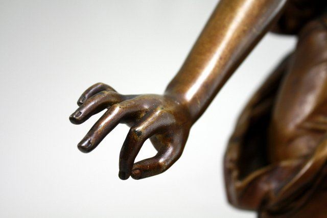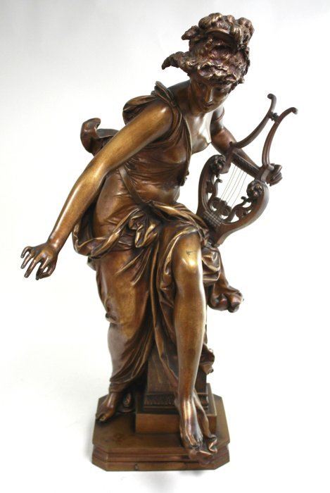 Young lady with a lyre. 19th century bronze sculpture "Melodie". Signed A. Carrier Belleuse Hors Concours, French (1824-1887). Approx. 31" H. Formerly a lamp. Some wear & marks.