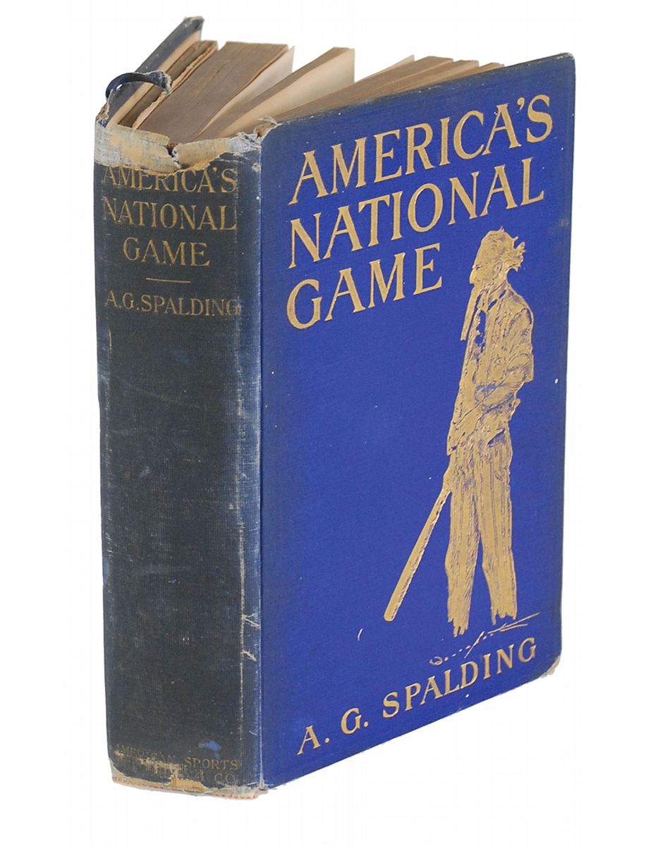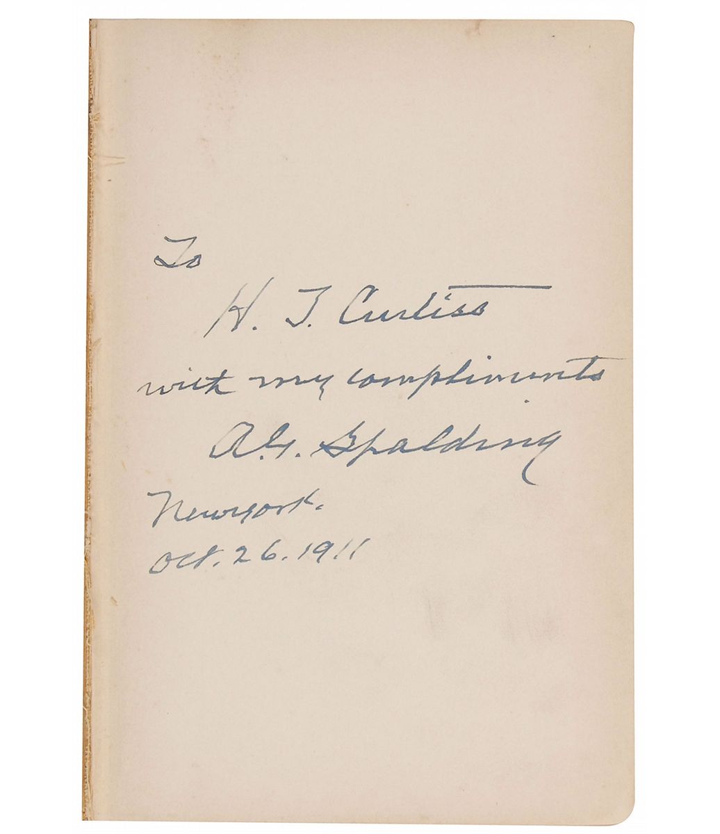 Signed book: America’s National Game. First edition. NY: American Sports Publishing Company, 1911. Hardcover, 5.5 x 8, 542 pages. Signed and inscribed on the first free end page in black ink, “To H. J. Curtiss, with my compliments, A. G. Spalding, New York, Oct. 26, 1911.” Autographic condition: fine, with slight foxing to page. Book condition: G-/None, with textblock separated from covers. Spalding’s groundbreaking book, which is illustrated throughout with photos (including panoramic fold-out images of Shibe Park and other landmarks), traces the history of the game from antiquity. By the time Spalding reaches the mid-nineteenth century, his close, detailed examination proceeds virtually season by season. Other topics include ‘Base Ball and Religion,’ ‘Poetic Literature of Base Ball,’ ‘Curved Ball Controversy,’ and ‘The Psychology of Base Ball.’