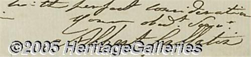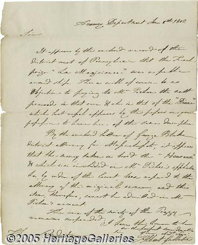 <B>Albert Gallatin 1802 Autograph Letter Signed</B></I> "Albert Gallatin" as President Thomas Jefferson's Secretary of the Treasury, one page, 8" x 10". Treasury Department, June 8, 1802. To "The Auditor." In part: "It appears by the enclosed record of the district court of Pennsylvania that the French prize 'La Magicienne' was a public armed ship. There will... be no objection to paying... proceeds in that case & also in that of the 'Diana' which last vessel appears by the papers in your possession... " In the late 1790s, U.S. relations with France were strained, resulting in an undeclared war between the two countries and a cessation of diplomatic relations. The conflict continued until the September 30, 1800 Treaty of Morfontaine, which went into effect on December 21, 1801. This letter was concerning prize court decisions in Pennsylvania and Massachusetts. The operation of U.S. prize courts during the conflict further demonstrated that America and France were really in a state of war. A prize court is an admiralty court that adjudicates wartime captures made at sea and "condemns" lawfully captured enemy vessels, awarding them as prizes to their captors. Gallatin served in the American Revolution, and later represented Pennsylvania in Congress from 1795 until 1801, when he was appointed Secretary of the Treasury by Thomas Jefferson. In fragile condition. Chipped, nicked and worn edges. Lightly creased. Horizontal folds do not touch signature. <I>Accompanied by COA from PSA/DNA.</B></I>