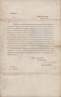 Printed circular letter signed “Albert Gallatin” as Secretary of the Treasury dated 16 November 1808, addressed on integral leaf to “Joseph Wilson Esqr. / Collector / Marblehead [Port] / Massa.” Upon an order from Congress, Gallatin asks for names and addresses of violators of the Embargo Act: ''…you will…immediately prepare and transmit to me a concise statement of all the evasions and violations aforesaid…'' Letter also franked ''Albert Gallatin.'' 1pp. measures 8” x 12.5”. Adhesive tape at some edges and small tears. Very good.