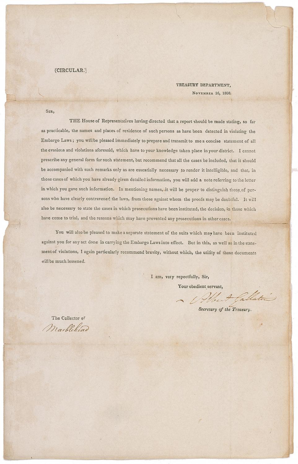 Printed circular letter, one page, 8 x 12.5, November 16, 1808. Sent to Joseph Wilson, the Collector in Marblehead, Massachusetts, the letter reads, in part: “The House of Representatives having directed that a report should be made stating, so far as practicable, the names and places of residence of such persons as have been detected in violating the Embargo Laws; you will be pleased immediately to prepare and transmit to me a concise statement of all the evasions and violations aforesaid, which have to your knowledge taken place in your district…In mentioning names, it will be proper to distinguish those of persons who have clearly contravened the laws, from those against whom the proofs may be doubtful…You will also be pleased to make a separate statement of the suits which may have been instituted against you for any act done in carrying the Embargo Laws into effect …” Second integral page bears an address panel in another hand, free franked in the upper portion, “Albert Gallatin,” and stamped “Free.” In very good condition, with a few small areas of paper loss and tears to corners and hinge, scattered toning, and partial separations along intersecting folds, one through a single letter of signature.