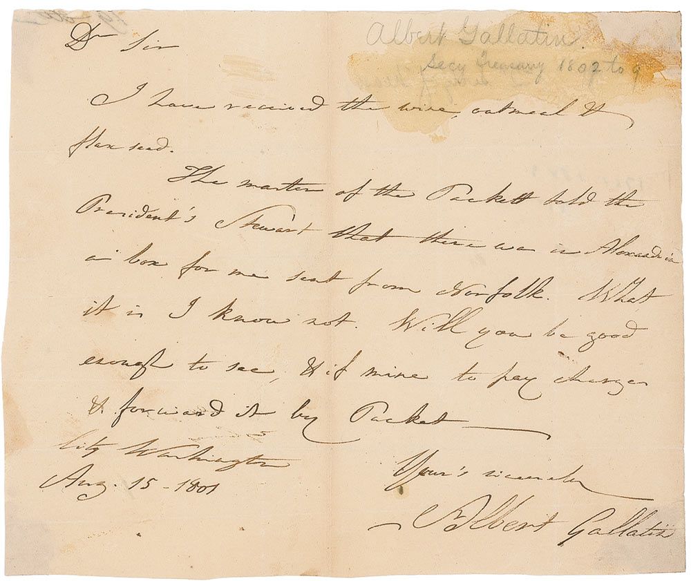 Politician and financial genius responsible for the formation of what is now known as the Ways and Means Committee. ALS, one page, 8 x 6.5, August 15, 1807. “I have received the wine, oatmeal & flax seed. The master of the Packett told the President’s Stewart that there was in Alexandria a box for me sent from Norfolk. What it is I know not. Will you be good enough to see & if mine to pay charges & forward it by Packet.” In very good condition, with intersecting folds, scattered creasing, light toning, trimmed edges, and a moderate adhesive stain and pencil notations to the top right corner.