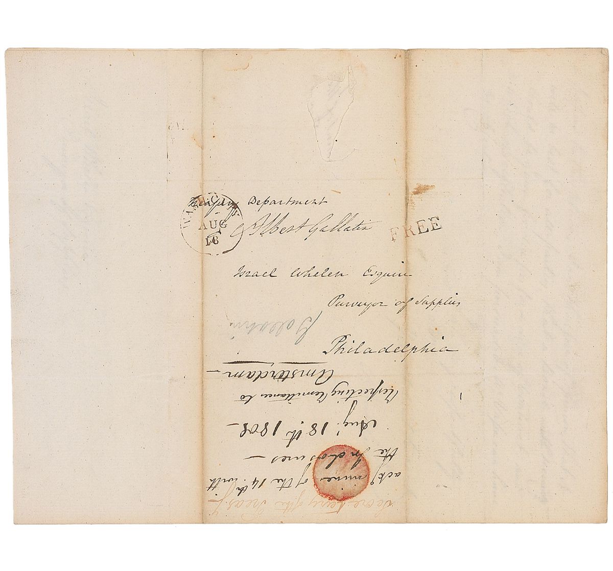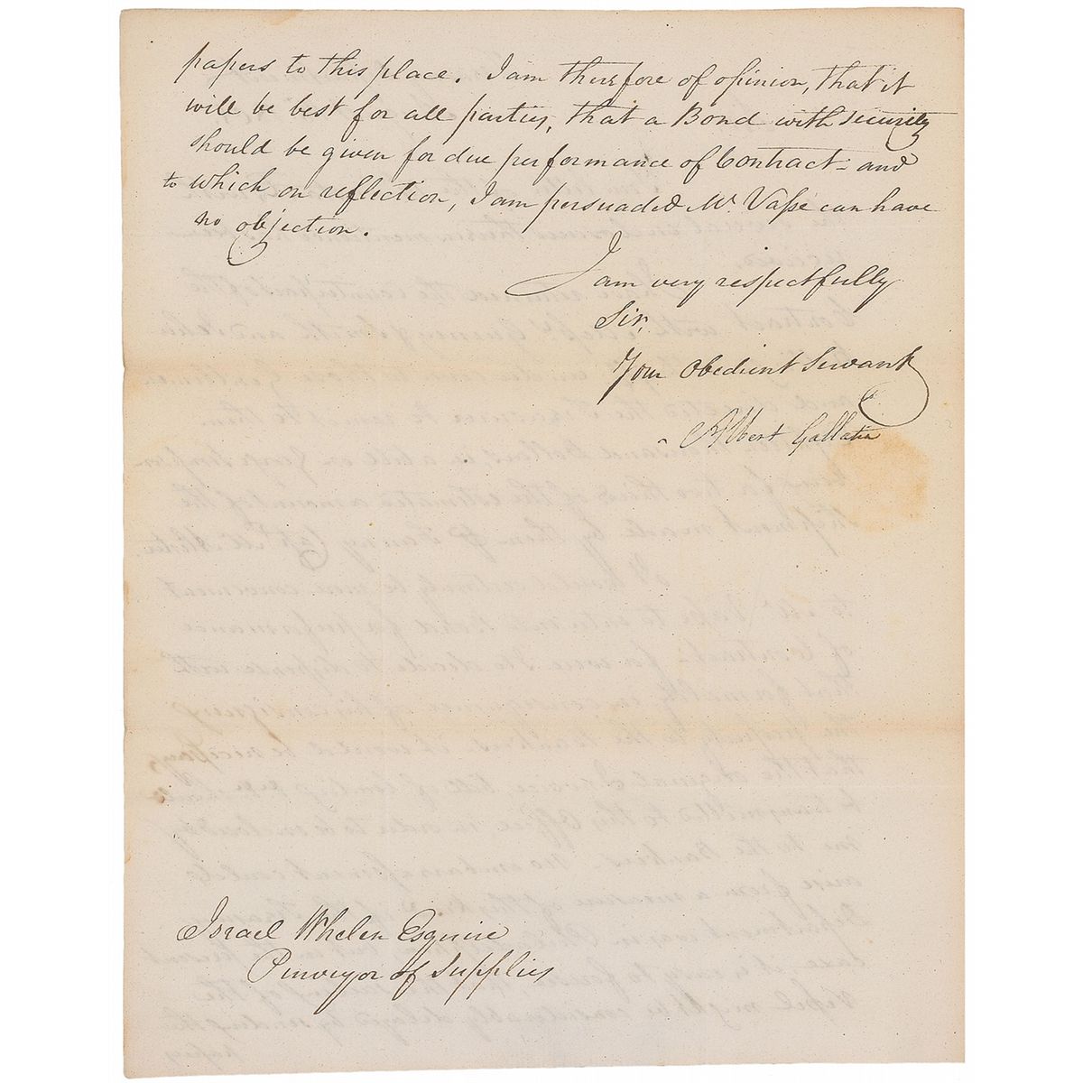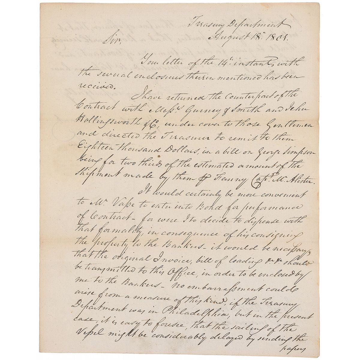 Politician and financial genius (1761–1849) responsible for the formation of what is now known as the Ways and Means Committee. LS, one page both sides, 8 x 10, August 18, 1801. Letter to Israel Whelen. In part: “I have returned the counterpart of the contract with Messrs Gurney & Smith and Jehu Hollingsworth & Co…and directed the Treasurer to remit to them Eighteen thousand dollars, in a bill on George Simpson being for two thirds of the estimated amount of the shipment made by them.” The address panel on the reverse of the second integral page is filled out in another hand but free franked at the top by Gallatin, “Albert Gallatin.” In fine condition, with intersecting folds and subtle toning.