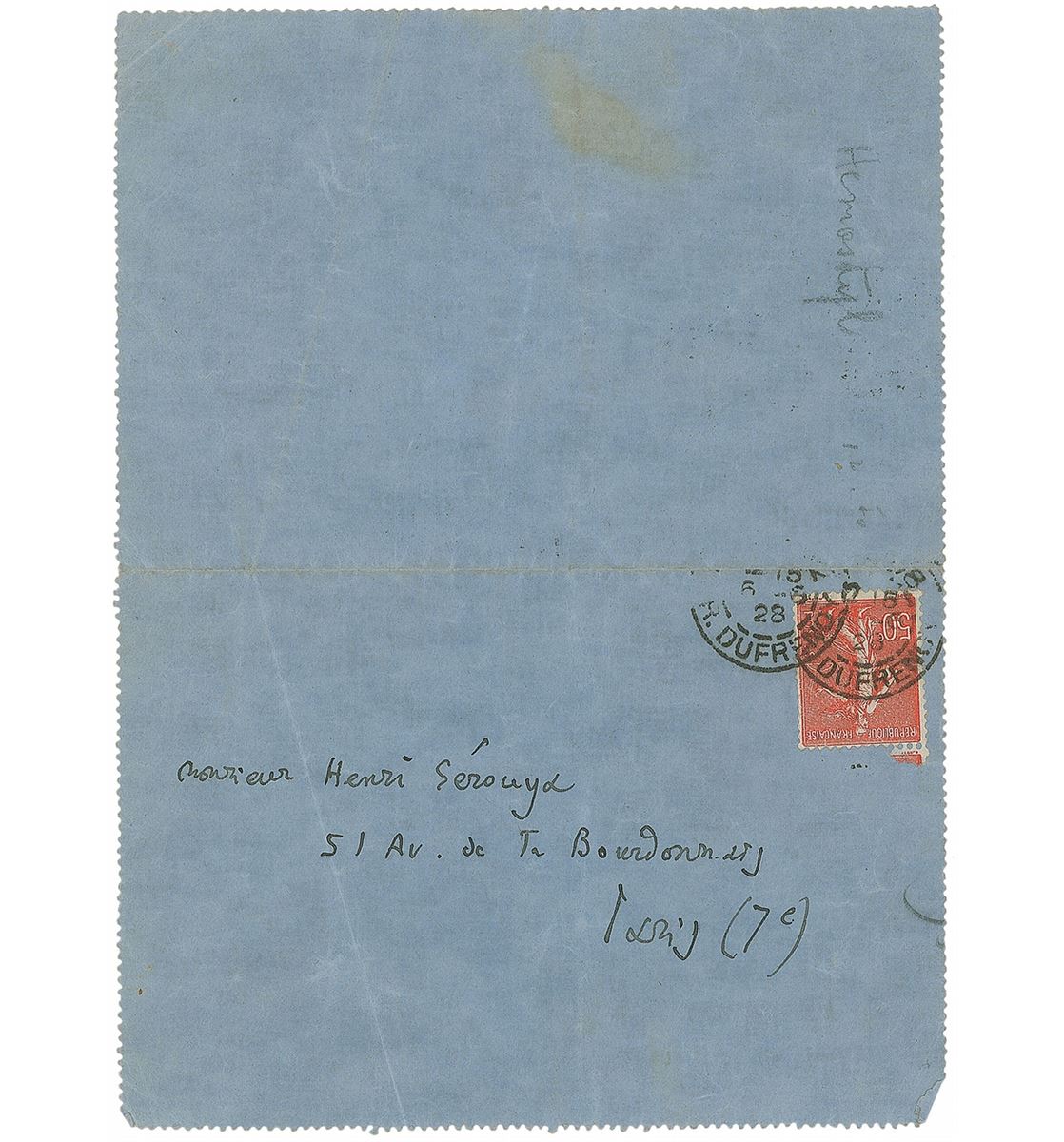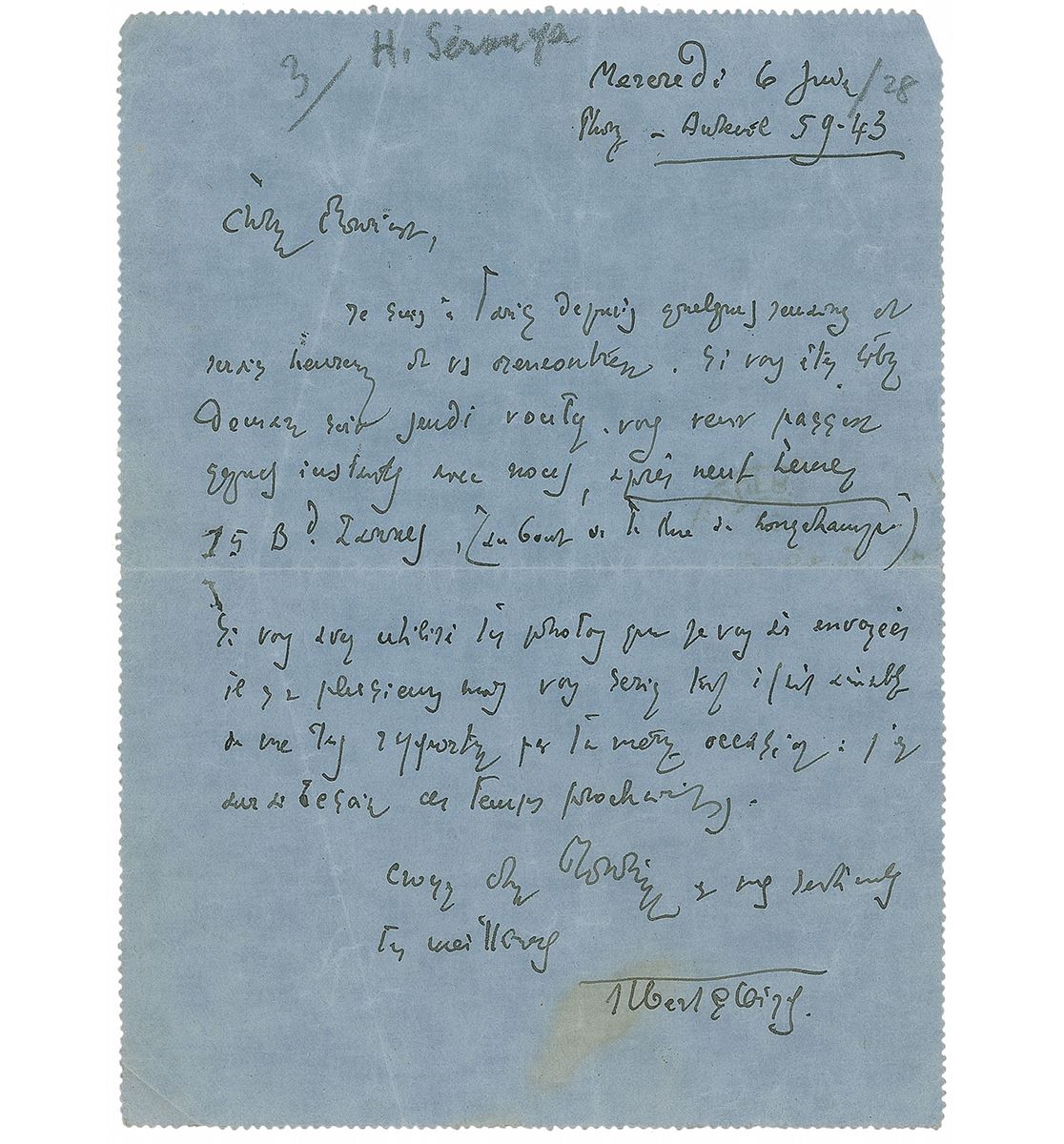 French artist, theoretician, philosopher, and self-proclaimed founder of Cubism (1881–1953). ALS in French, one page, 5 x 6.75, June 6, 1928. Untranslated letter to Henri Serouya, specialist in Middle Eastern and oriental studies, informing him that he will be in Paris for a few weeks, and discussing some photos he had previously given Serouya. In very good condition, with overall creases and a small stain to the signature area.