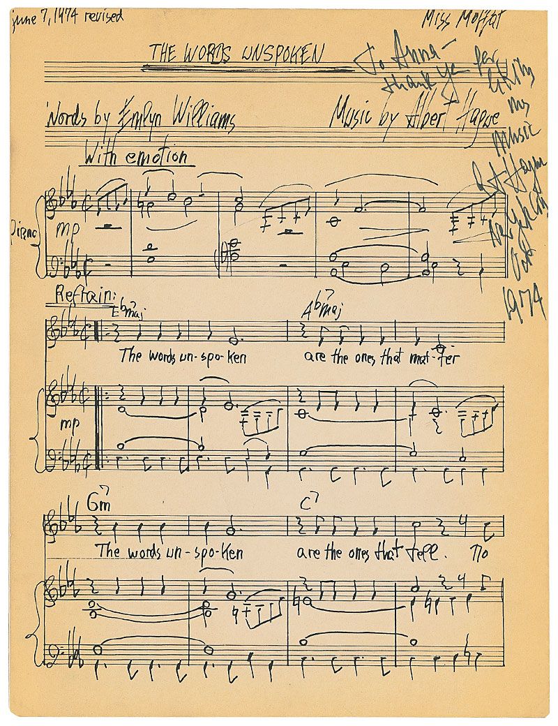 Songwriter, composer, and actor (1920–2001) known primarily for his work on Broadway. Facsimile manuscript sheet music for ‘The Words Unspoken,’ 9.5 x 12.5, five pages, signed and inscribed in the upper right in black felt tip, “To Anna—thank you for liking my music, Albert Hague, New York City, Oct. 1974.” Moderate toning working in from the borders and complete tape-repaired separation to the last page, otherwise fine condition.