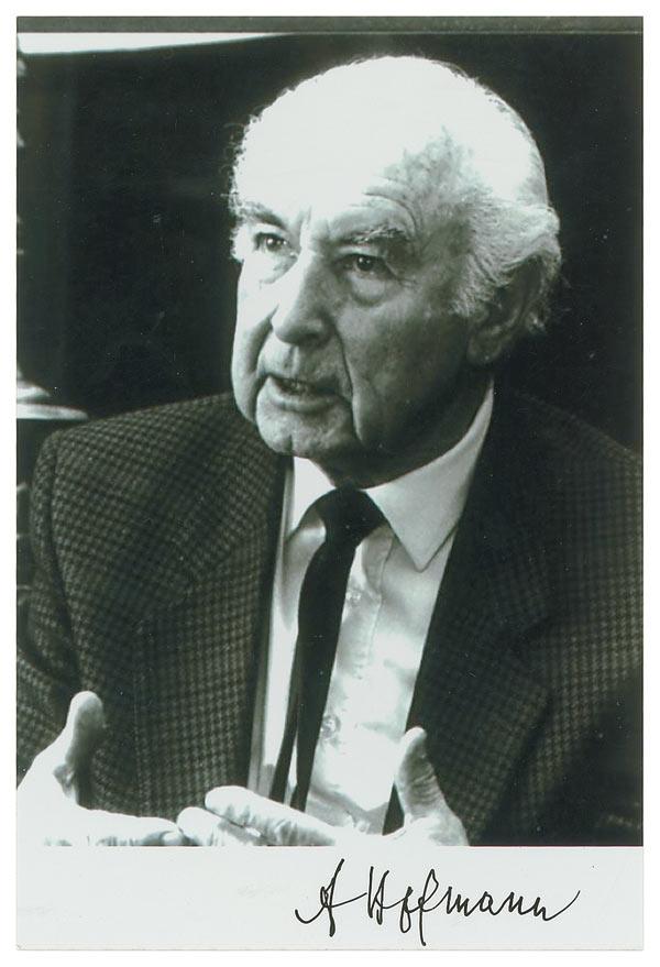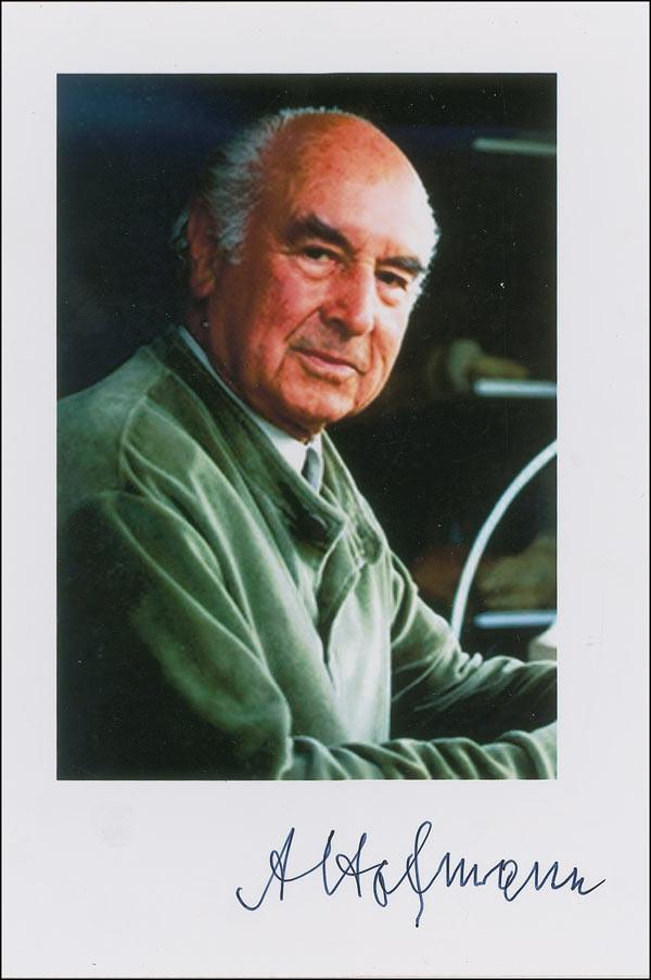 Swiss chemist (1906-2008) best known for the discovery of LSD. Two signed glossy photos: a color 4 x 6 casual photo signed in black felt tip “A. Hoffmann”; and a 4 x 6 photo of Hoffmann in a suit and tie also signed in black felt tip “A. Hoffmann.” In overall fine condition with a few bends and a light semi-circular stain along the left side of the color image.