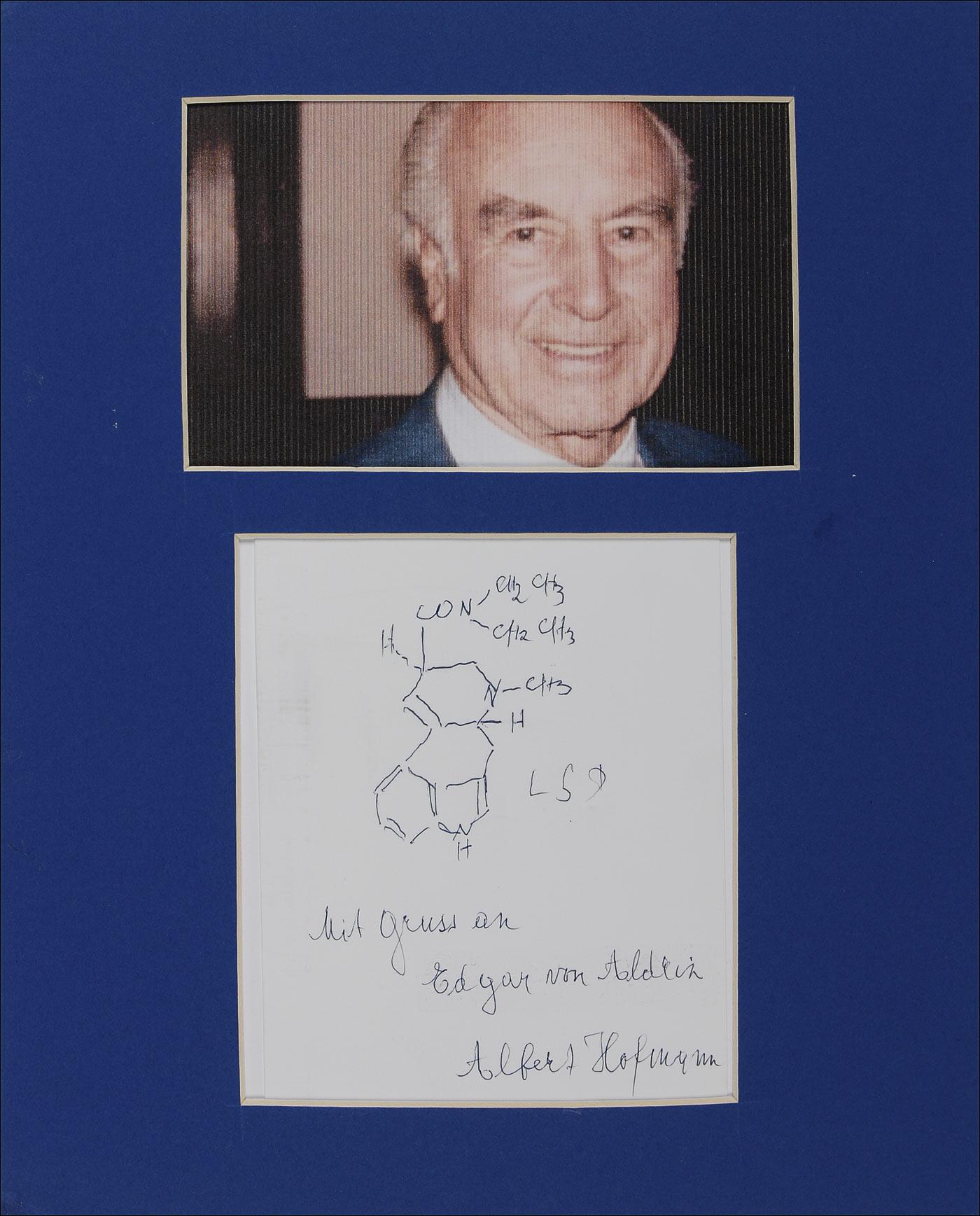Swiss chemist (1906-2008) best known for the discovery of LSD. Original signed and inscribed ballpoint sketch of chemical structure of LSD on an off-white 3.75 x 5 card. Matted with a small color portrait of Hoffman, to an overall size of 8 x 10. In fine condition. Pre-certified PSA/DNA and RRAuction COA.