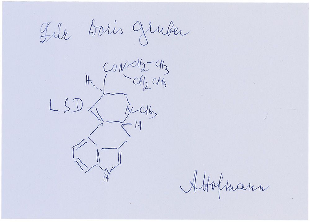 Swiss chemist (1906–2008) best known for the discovery of LSD. Original signed and inscribed ballpoint sketch of the chemical structure of LSD on a white 5.75 x 4 card, signed and inscribed “Fur Doris Gruber, A Hoffman.” In fine condition.