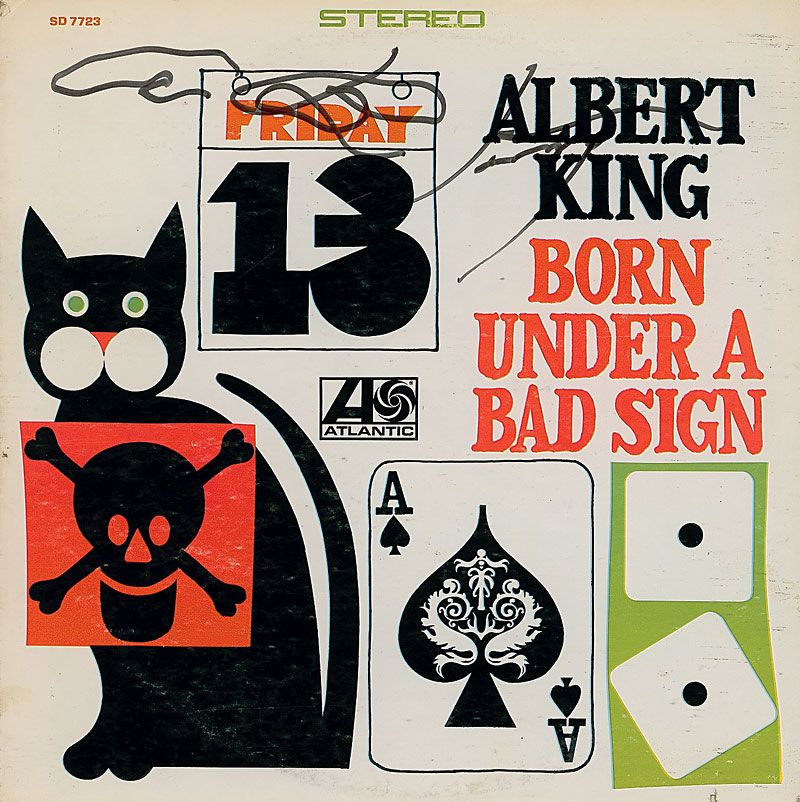 American blues guitarist and singer who was a major influence in the world of blues guitar playing, specifically for Hendrix and Clapton (1923–1992). Born Under a Bad Sign album signed on the front cover in black felt tip. In fine condition, with light overall toning and a discount cut to the lower right. The record is included.