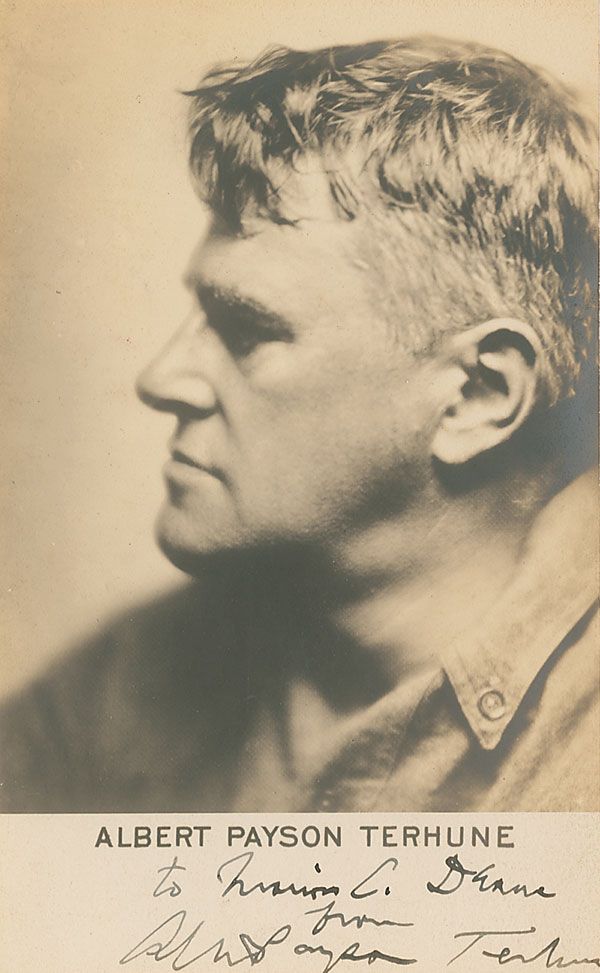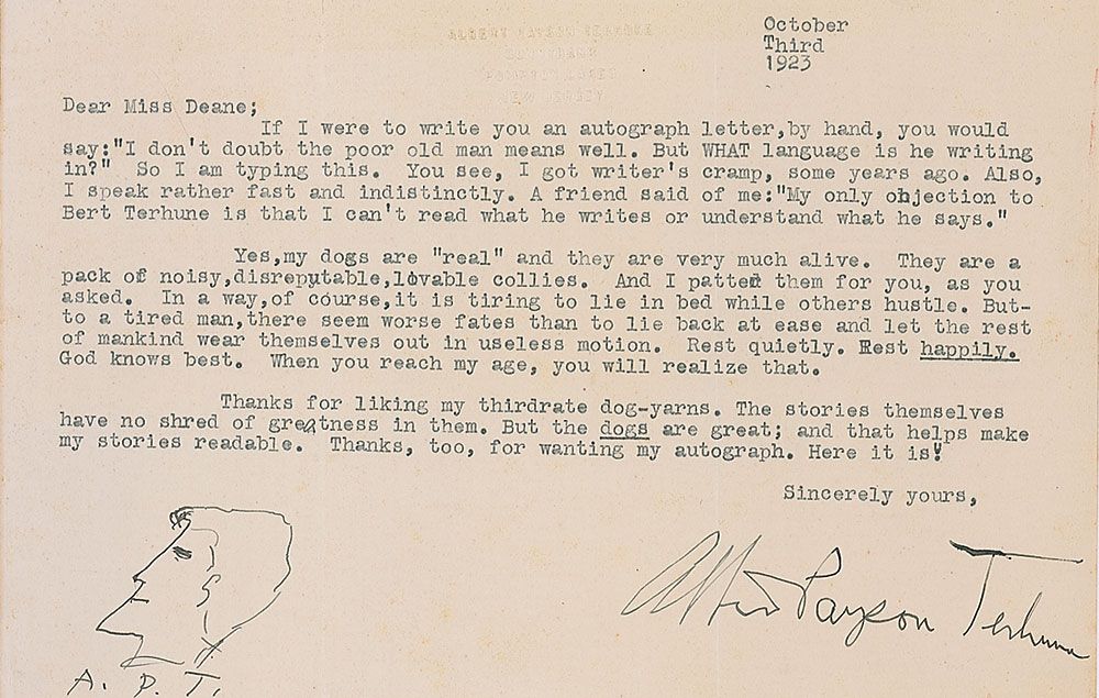 Author and dog breeder (1872–1942). TLS, one page, 9 x 5.75, personal letterhead, October 3, 1923. Letter to an admirer reads, in part, “Yes, my dogs are ‘real’ and they are very much alive. They are a pack of noisy, disreputable, lovable collies. And I patted them for you, as you asked…Thanks for liking my thirdrate dog-yarns. The stories themselves have no shred of greatness in them. But the dogs are great; and that helps make my stories readable. Thanks, too, for wanting my autograph.” In the lower left corner, Terhune has added a nice profile self-portrait sketch, adding his initials underneath; and a vintage 3.25 x 5.25 postcard photo, signed and inscribed in the lower border in fountain pen. In fine condition.