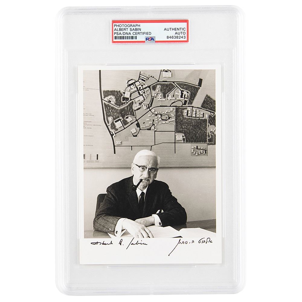 Matte-finish 5 x 7 photo of Albert B. Sabin in his office as president of the Weizmann Institute, signed in the lower border in black felt tip. In very fine condition. Encapsulated in a PSA/DNA authentication holder.