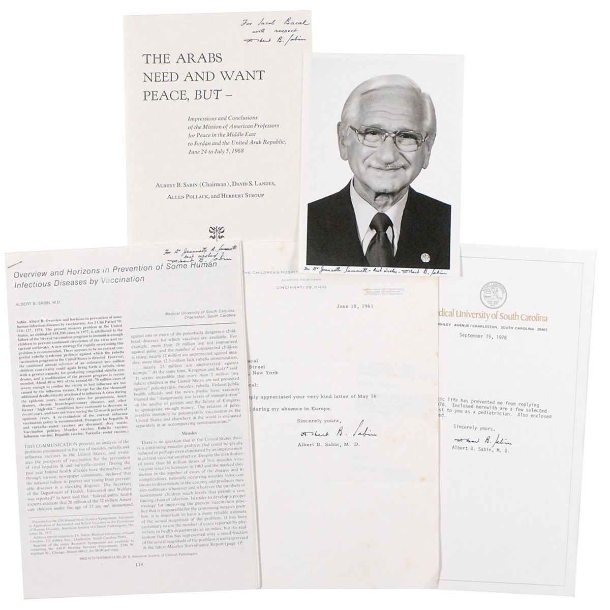 Collection of five items signed by Sabin, including: a glossy 5 x 7 photo (inscribed); a 1961 TLS; a 1978 TLS; a lengthy copy of a report on vaccination (inscribed); and a pamphlet about peace in the Middle East (inscribed). Overall foxing to one letter, otherwise overall fine condition. Accompanied by three unsigned reports by Sabin.