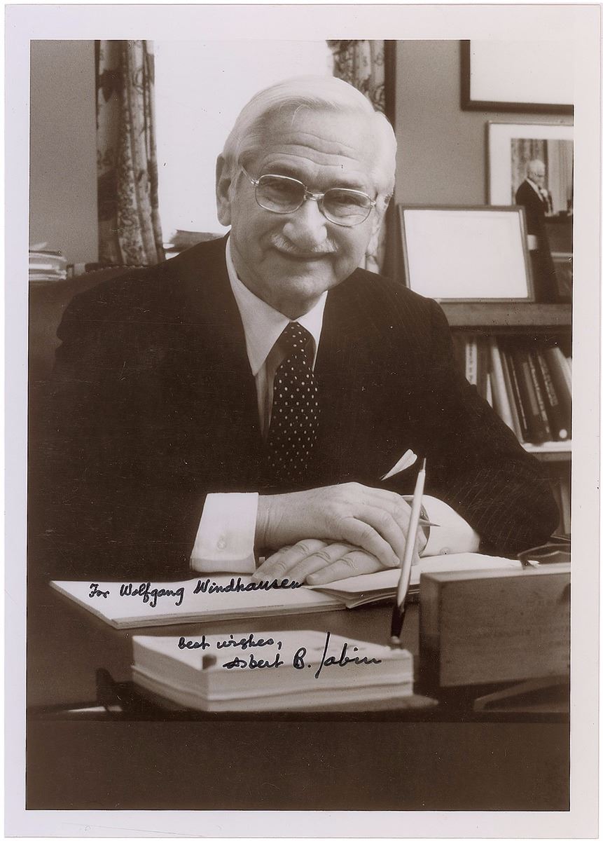 Glossy 5 x 7 half-length photo of Sabin sitting at his desk, neatly signed and inscribed in black ink, “For Wolfgang Windhauser, Best wishes, Albert B. Sabin.” In fine condition.