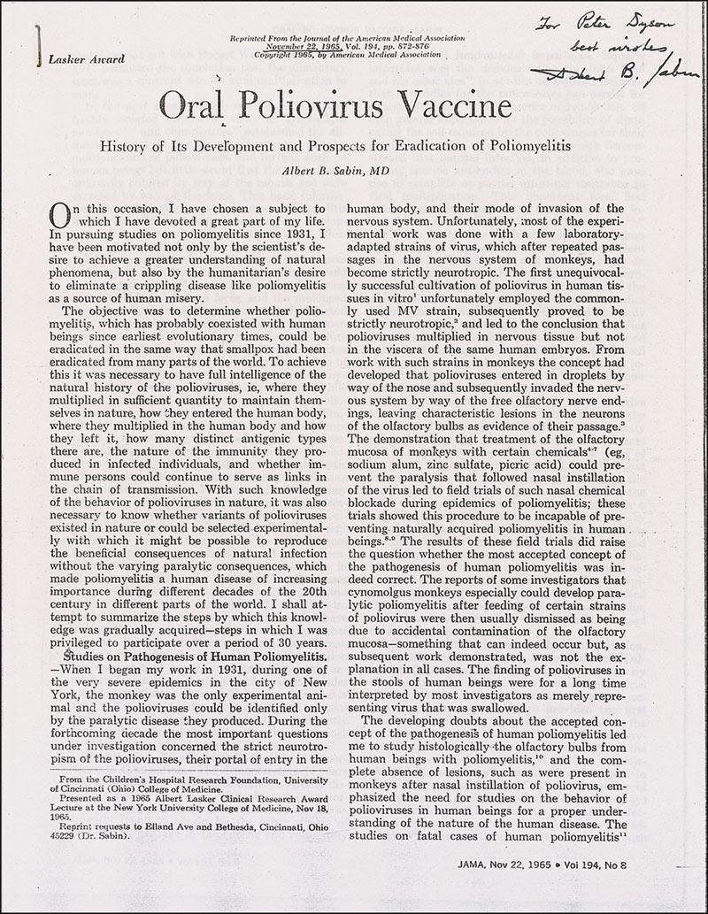 American medical researcher (1906–1993) best known for developing a practical oral polio vaccine. Photocopied article from the Journal of the American Medical Association entitled “Oral Poliovirus Vaccine,” five pages, 8.5 x 11. Signed and inscribed on the top of the first page, “For Peter Dyson, best wishes, Albert B. Sabin.” In fine condition.