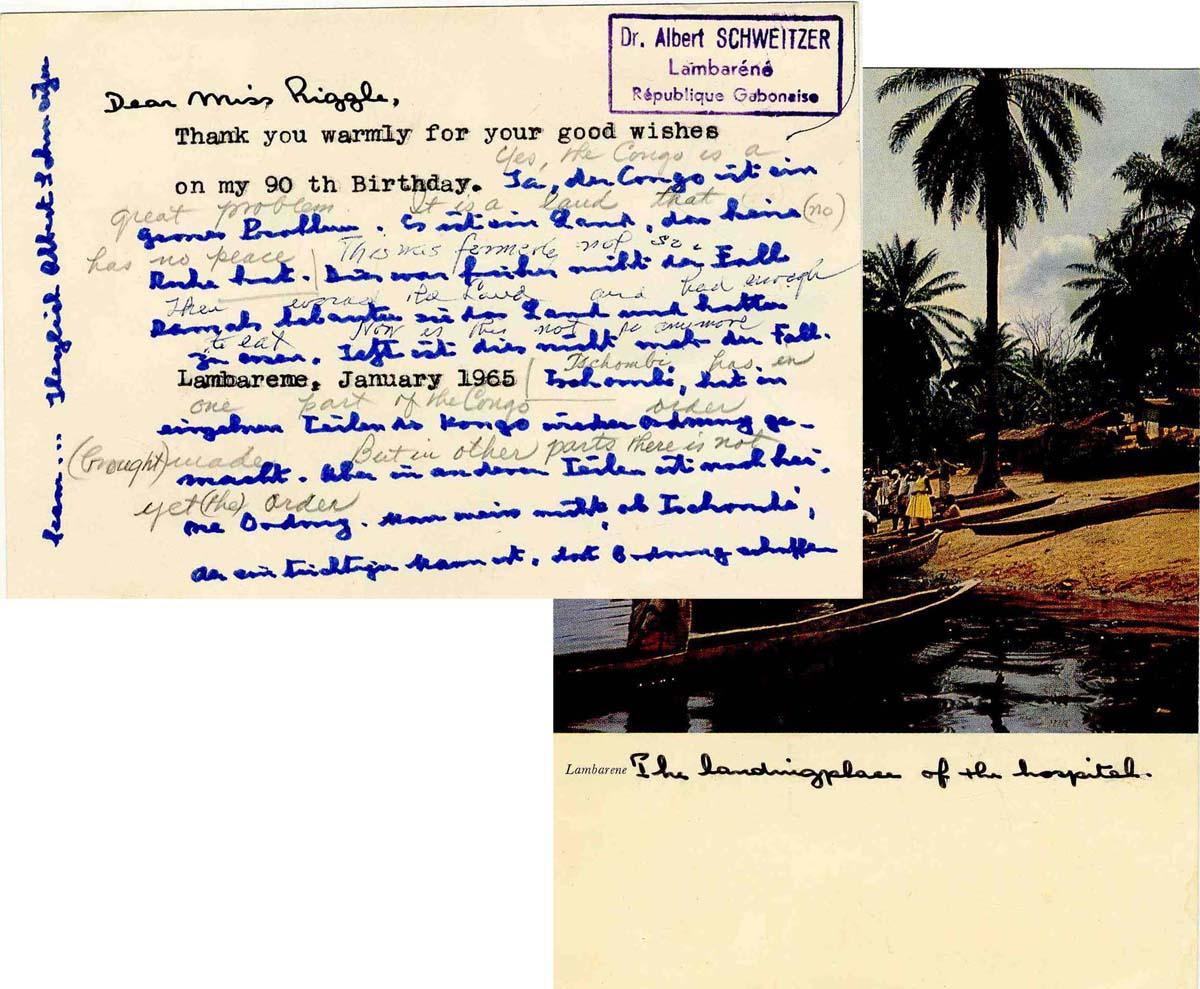 Albert Schweitzer autograph letter signed, datelined Lambarene, January 1965. Written on the back of a picture postcard showing ''The landing place of the hospital,'' Schweitzer writes to Dorothy Riggle regarding political problems of the Congo. Signed in blue ink vertically on the left side of the card, “Albert Schweitzer.'' Written in German, with both pen and pencil translations above Schweitzer's handwriting. 4” x 5.75” card is in very good condition with transmittal envelope.