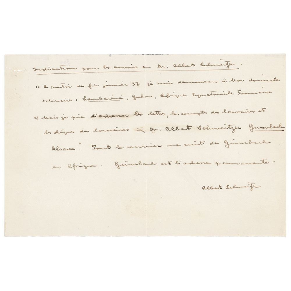 Handwritten manuscript in French, signed three times (twice within the text, and once at the conclusion), one page, 8.25 x 5.25, headed (translated): "Indications for shipments to Dr. Albert Schweitzer." In the document, Schweitzer provides instructions for addressing mail to him in Lambarene, Gabon, and Gunsbach, Alsace, France. In fine condition, with a short tear to the upper left edge.