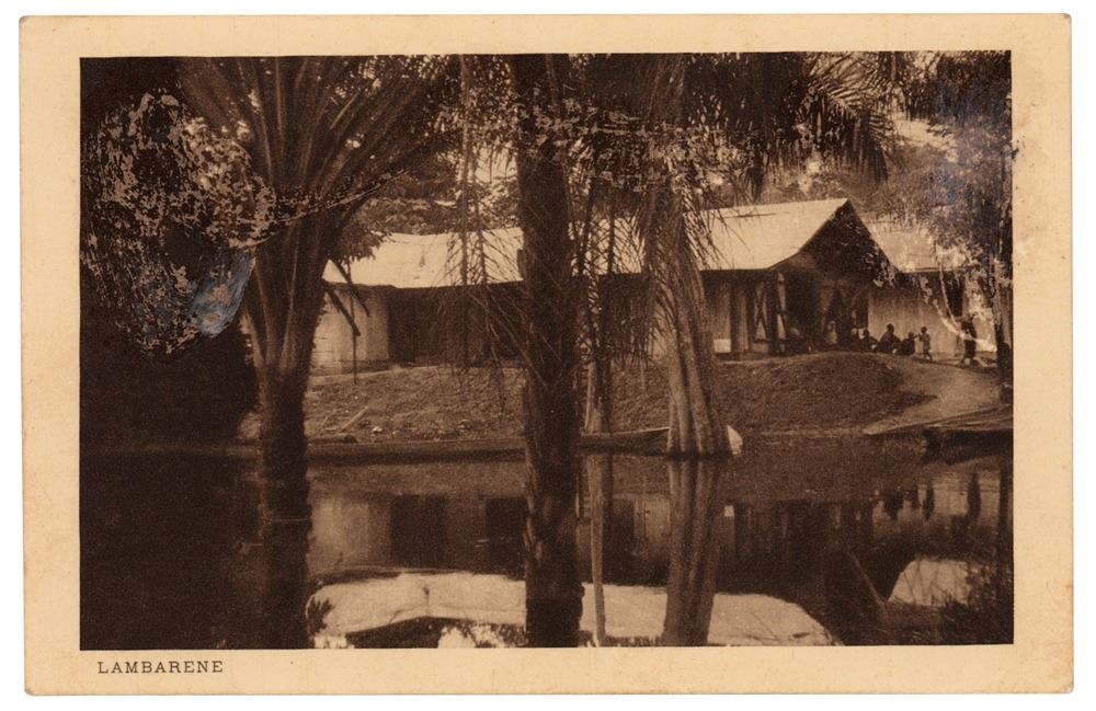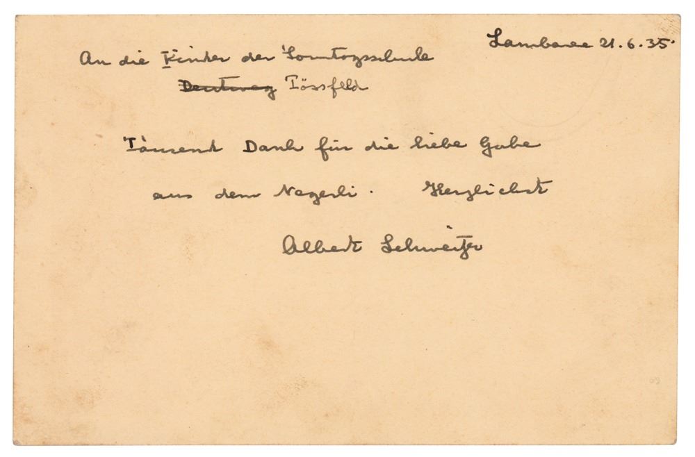 ANS in German, penned on the reverse of a 5.5 x 3.5 postcard of Lambarene, June 21, 1935. An untranslated handwritten note from Albert Schweitzer sending his thanks for a lovely gift. In fine condition, with some faint soiling.