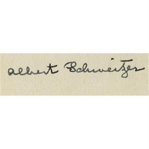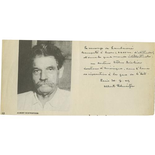 <B>Albert Schweitzer Photo With a Lengthy Inscription and Signature, to an Old Friend.</B></I> Schweitzer, Albert. French physician, missionary to Africa, musician. Printed head and shoulders photo, from a publication, with a lengthy inscription and signature by Schweitzer. The photo image is 3 by 4 inches, with Schweitzer's writing on a blank area to the right of the photo. He has written in French: <I>"The savage of Lamberene, transported to aspen (2400 meters altitude) and to the great intellectual world, to Doctor Arthur Briskier on his return from America, at te Moment to separation in the Gare de l'Est. Paris, July 30, 1949 Albert Schweitzer." </B></I> Dr. Briskier was an old friend. Fine condition; excellent for display.