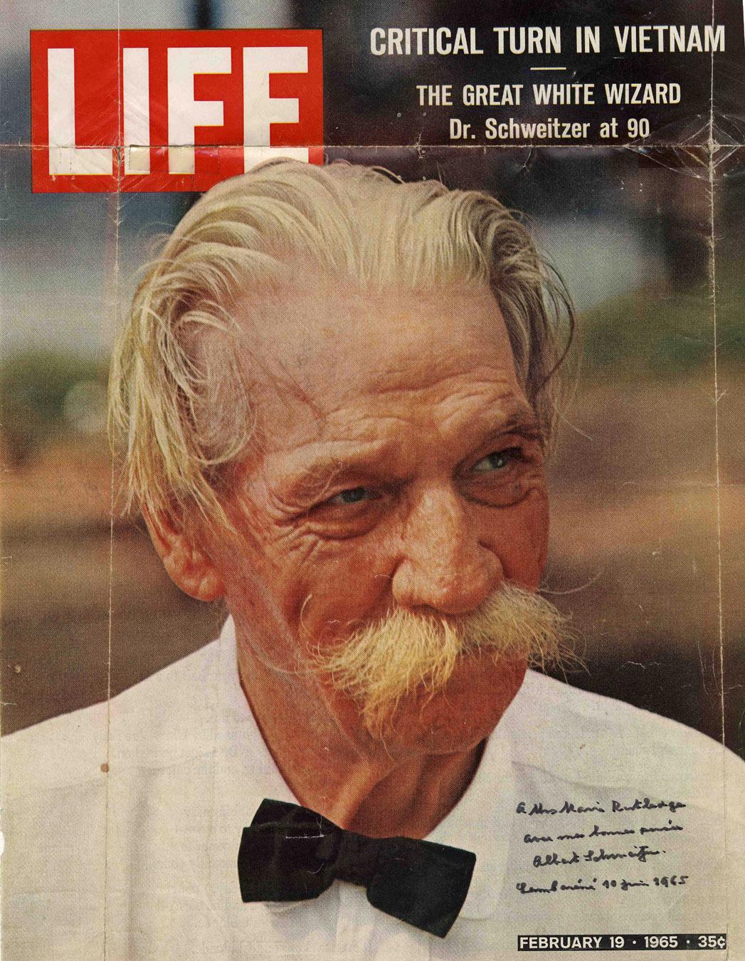 Dr. Albert Schweitzer Signed & Inscribed ''Life'' Magazine Cover -- 19 Feb. 1965 Issue Inscribed on 10 June -- 9.75'' x 13.25'' -- Good, Save Folds