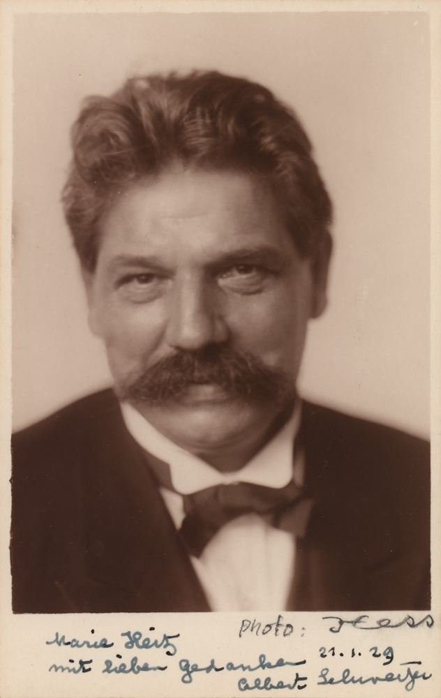 Vintage matte-finish 3.5 x 5.5 postcard photo of the great German theologian by the N. & C. Hess Studio, signed and inscribed in the lower border in fountain pen, "Marie Heitz, mit lieben gedanken, Albert Schweitzer, 21. 1. 29." In very fine condition.