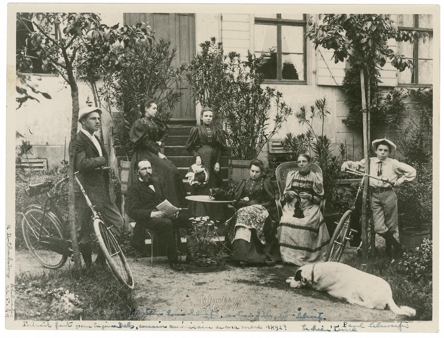 Vintage matte-finish 9.25 x 7 1892 Schweitzer family portrait outside their Günsbach home by Zahneissen, including the then 17-year-old Schweitzer, signed and inscribed in the lower left border in blue ink in French “To Dr Charles Joy, A. Schweitzer 22.5.49.” Those pictured are identified by Albert Schweitzer in French: “A Schweitzer, Pastor Louis Schweitzer, his three daughters, Mme Schweitzer, Paul Schweitzer, the dog Turck.” Schweitzer has also written in the narrow lower border, “Portrait made for Eugene Debs, American cousin of my mother 1892?” Signature a bit cramped, and moderate contrast to beginning of notation along bottom, including second signature, otherwise fine condition. A unique and informational family portrait.