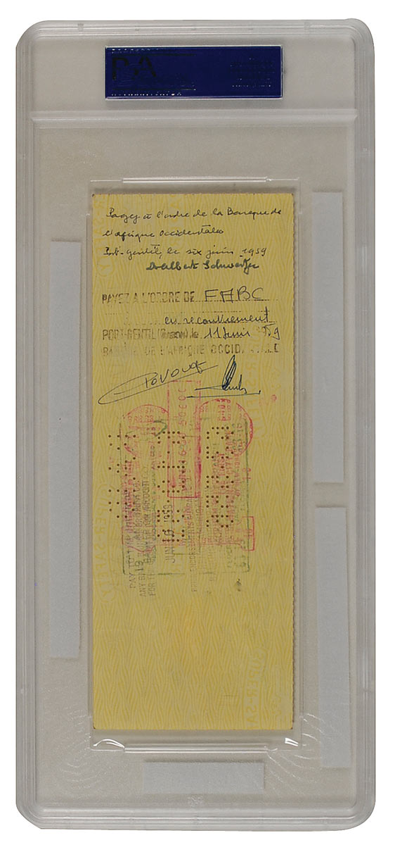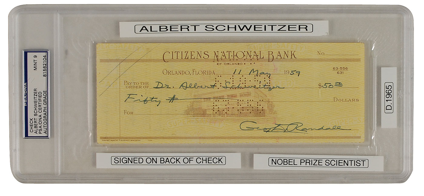 Bank check, 8.25 x 3, filled out and signed by George Randall, payable to Dr. Albert Schweitzer for $50.00, May 11, 1959, endorsed by Schweitzer on the reverse, “Dr. Albert Schweitzer.” Encapsulated in a PSA/DNA authentication case. In fine condition, with expected cancellation holes and stamps, none of which affect the endorsement signature on the reverse.