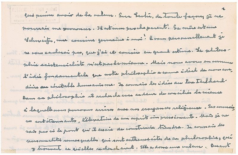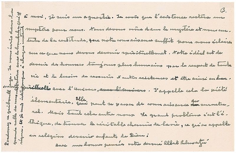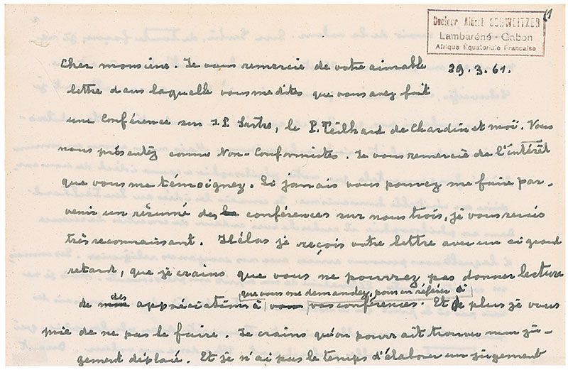 ALS in French, three pages on two sheets, 8.25 x 5.25, blind-stamped personal letterhead, Lambaréné, Gabon, March 29, 1961. Untranslated letter in French. In fine condition, with tape remnants to a few edges.