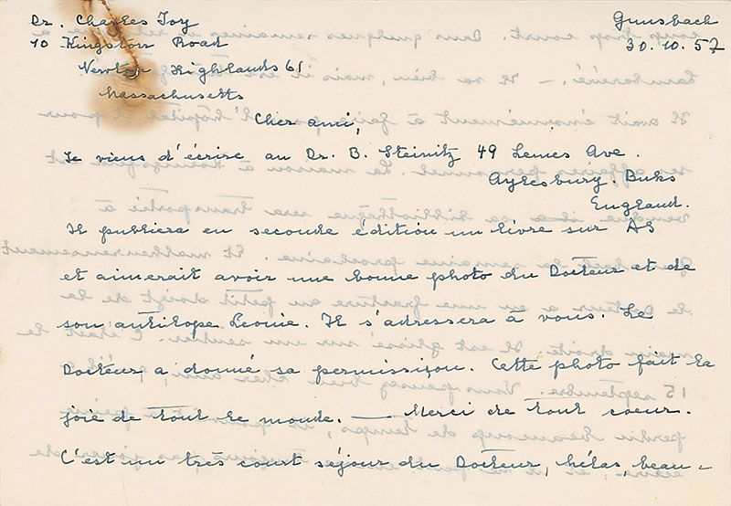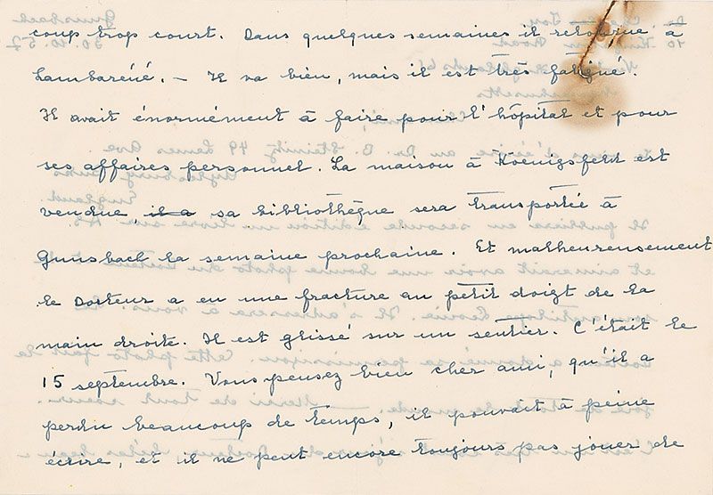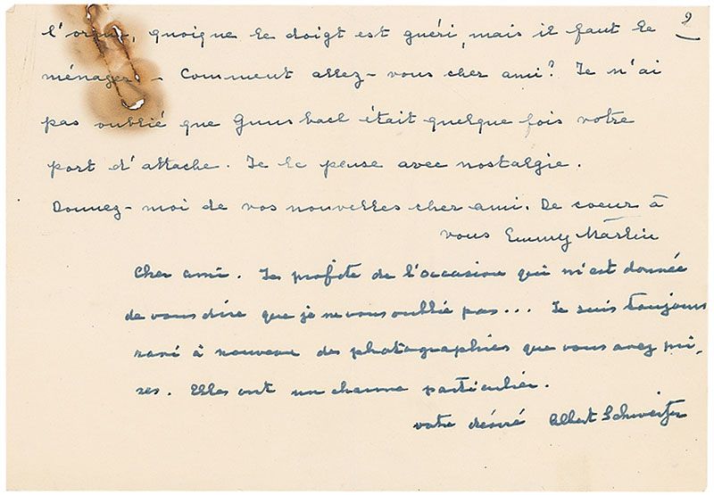 ALS in French, one page, 8.25 x 6, October 30, 1957. Short untranslated letter written at the conclusion of a longer letter, by Emmy Marlin. Rusty paperclip mark to top edge of both pages, with some resulting staining and paper erosion and a central vertical fold, otherwise fine condition.