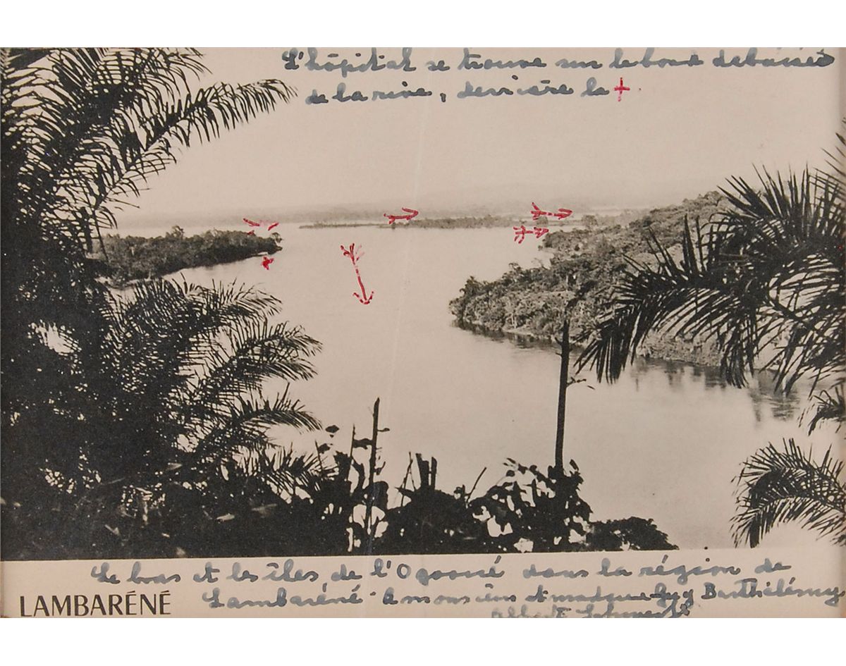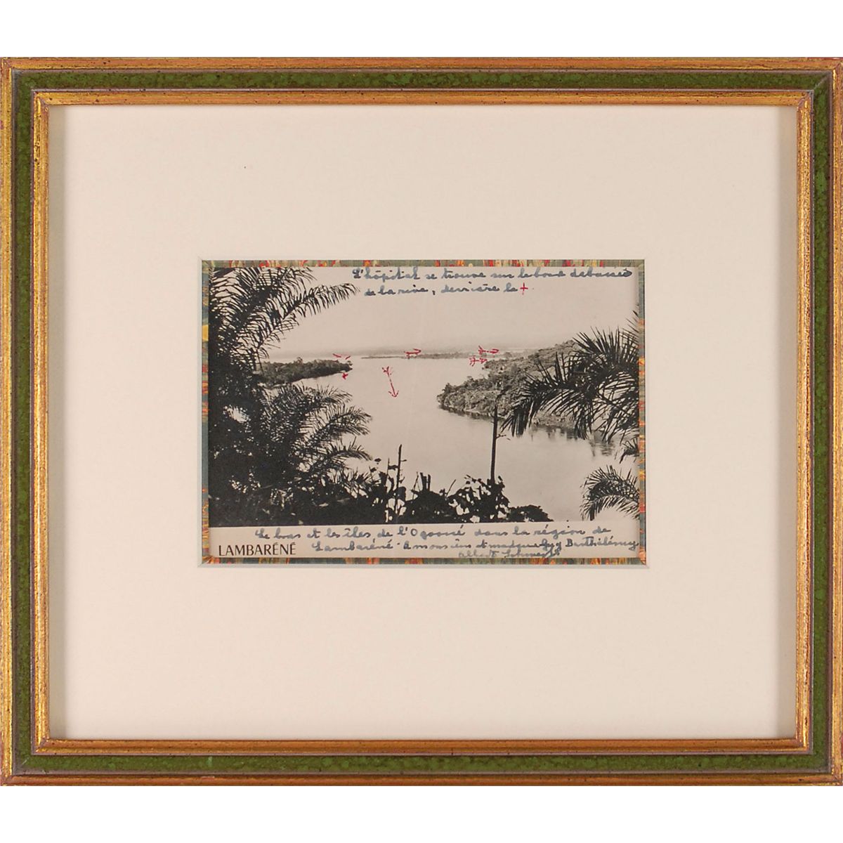 Uncommon 5.75 x 3.75 postcard photo showing a river scene in Lambarene, signed and inscribed in fountain pen in French, “To Monsieur and Madame Guy Barthelemy, Albert Schweitzer,” adding a description of the scene, “The hospital is located on the bank of the river, blocked from view, behind the +, the arm and islands of the Ogooue in the region of Lambarene.” Double-matted and framed to an overall size of 11 x 9.5. A central vertical crease, otherwise fine condition. Schweitzer established his renowned hospital in Lambarene in 1913, building it on the banks of the Ogooue River.