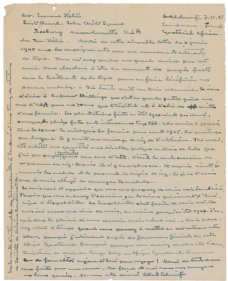 ALS in French, one onionskin page, 8 x 9.75, July 11, 1945. Neatly penned letter to Reverend Leonard Helie in Roxbury, Massachusetts, with Schweitzer adding a second signature, “Dr. A. S. Schweitzer,” at the top of the page in the return address area. In part (translated): “Thanks for your nice letter…with the information on the new treatment of leprosy. You’ve provided me a big service with this dispatch. We’re looking to be up to date in the progress made in the treatment of leprosy to help benefit our poor sickly. I just wrote to Prof. Skillings who is largely responsible for the gifts from the USA for my 70 years that makes CHEVITAL sheltered from a famine.” In fine condition, with intersecting folds and a small hole to blank portion of top edge.