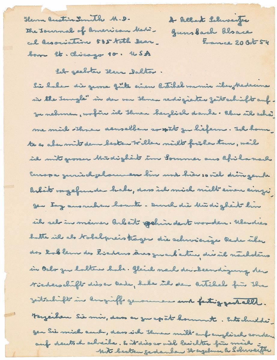 ALS in German, signed “A. Schweitzer,” one onionskin page, 8.5 x 11, October 20, 1954. Letter to Dr. Austin Smith at the Journal of the American Medical Association, in part (translated): "You have the great kindness to take and publish my article entitled ‘Medicine in the Jungle’ in one of your magazine’s editions and I would like to thank you warmly for it. I am therefore ashamed to send it so late. But I couldn’t…do it earlier because as I returned this summer, exhausted from Africa to Europe and got submerged with extremely urgent and important work, I didn’t find one single day of rest.” In very good to fine condition, with chipping along the edges of the fragile onionskin. Accompanied by an unsigned portrait of Schweitzer.