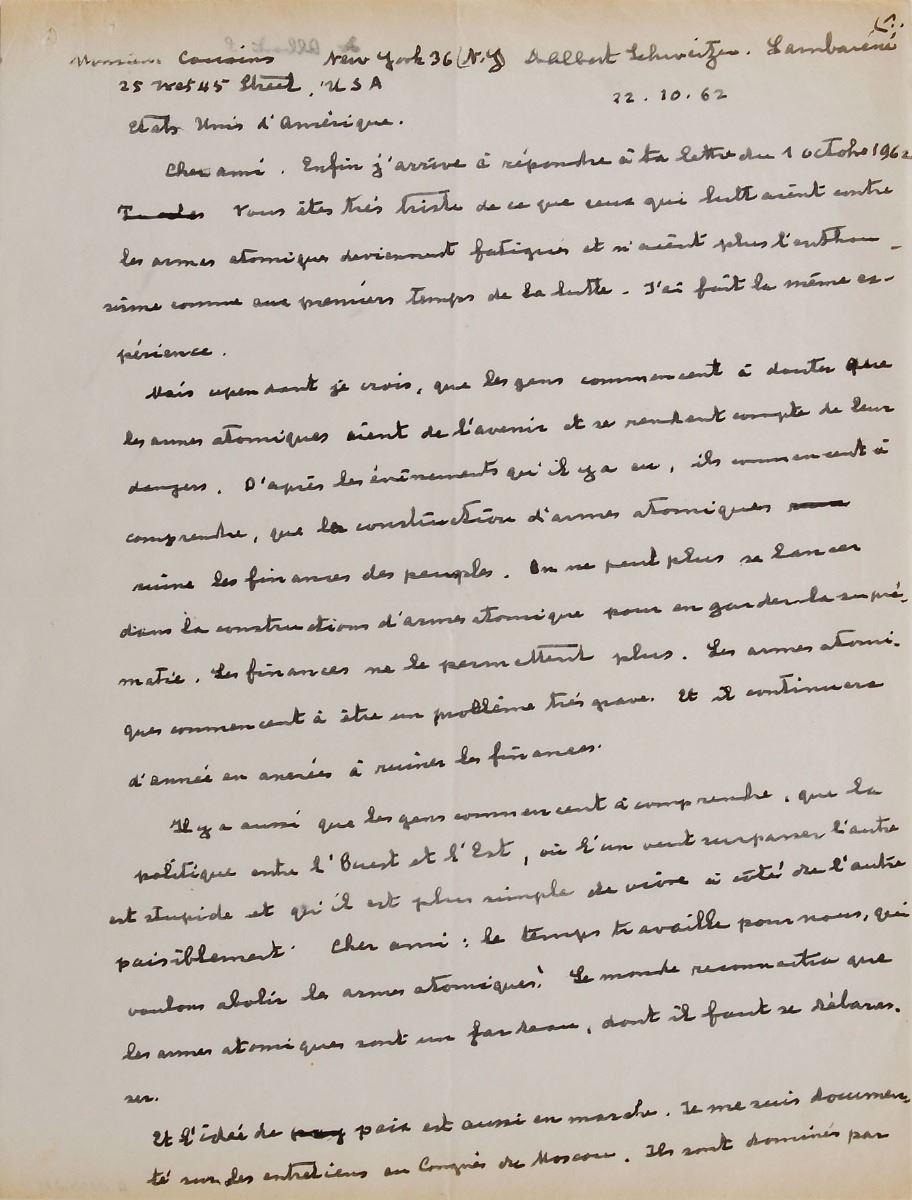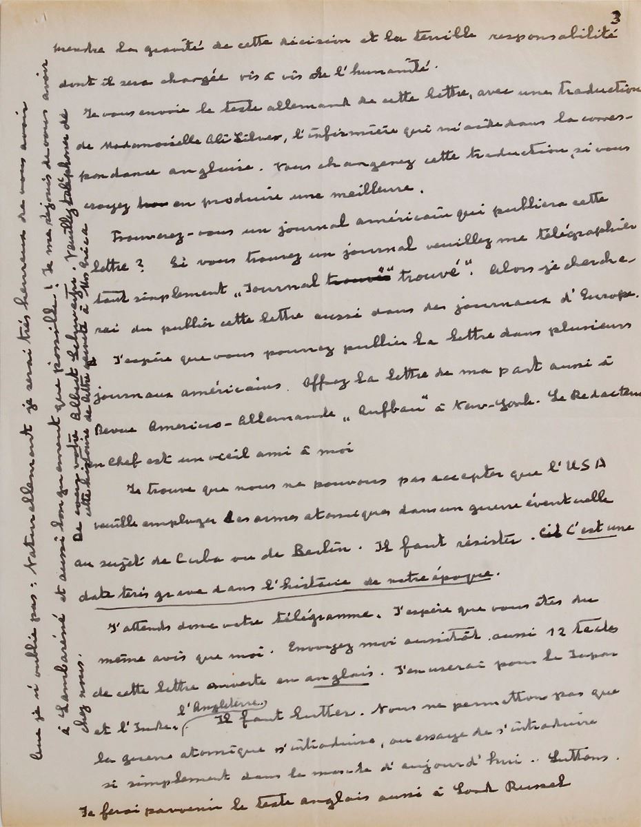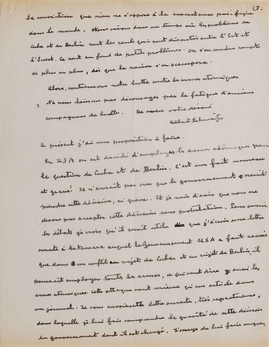 Schweitzer adds a lengthy postscript, in part: "The USA is determined to use atomic arms for the Cuban and the Berlin question. This is a new and serious development! I would not have believed that the government would dare to take this grave decision. And I feel that we must not accept this decision without protest. In order to have a debate, I think it would be useful for me to write an open letter to McNamara to whom the USA government has said that in a conflict involving Cuba or Berlin, he could use all weapons, which means atomic arms. This attack would be better than an article in a newspaper…I feel that we cannot accept that the USA could wish to use atomic weapons in a future war involving Cuba or Berlin. We must resist. This is a very momentous date in the history of our era…We must fight. We will not allow atomic war to enter, or attempt to enter, so easily into today’s world. Let us fight.” In fine condition, with light toning along top and bottom edges.