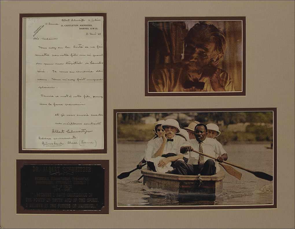 ALS in French, one page, 5 x 8, personal letterhead, June 3, 1928. Untranslated letter to a lady, neatly signed at the conclusion by Schweitzer, who also signed again along the top edge. Double matted with two color photos of Schweitzer, and a name plate, to an overall size of 18 x 14. In fine condition, with intersecting folds, one through a single letter of each signature, and a couple small pencil notations to top left.