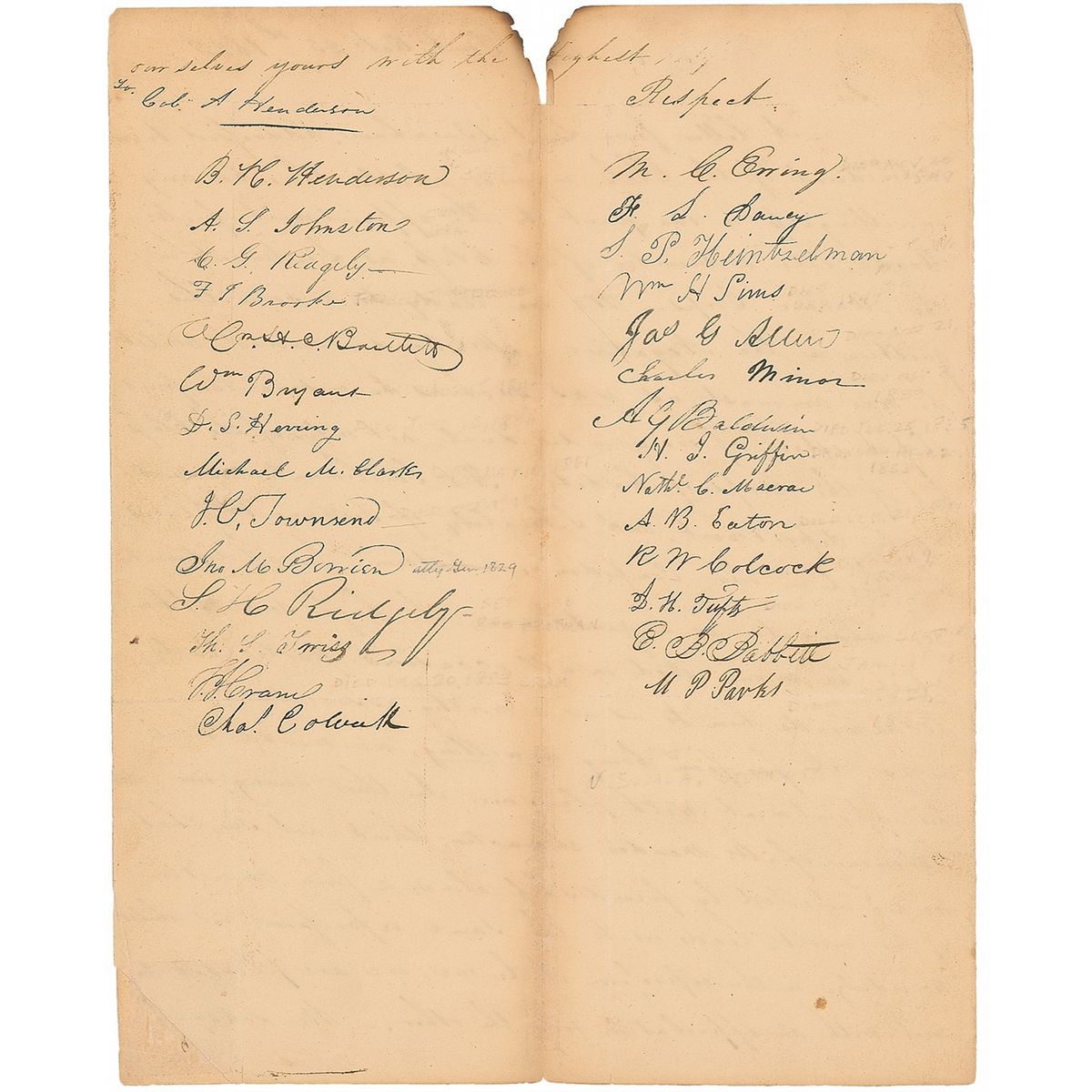LS signed by 28 members of West Point’s class of 1826, one page both sides, 7.75 x 9.5, October 25, 1825. A letter of recommendation for a classmate. In part: “A letter from Lieut. Burnham…enquires whether there be any unwillingness on our part to the appointment of Mr. Meade, late a member of the Class, as Lieutenant in the Marine Corps—We are ready to answer this question in the negative. Mr. Meade’s conduct whilst he was amongst us, was such as to ensure the friendship & esteem of every individual, not only of the Class, but of the Corps of Cadets. His gentlemanly conduct, many deportment, and liberality of sentiment, place him high in our confidence & esteem.” Signed on the reverse by 28 members of the class, including future Confederate General Albert Sidney Johnston, and future Union Generals Samuel P. Heintzelman and Amos Beebe Eaton. In very good condition, with intersecting folds with partial tape-repaired separations, a tape-repaired tear to lower left corner, and burn marks and paper loss to top edge. Johnston was the highest-ranking officer, Union or Confederate, killed during the entire Civil War, and given his early death at the at the Battle of Shiloh on April 6, 1862, his signature is excessively scarce in any form. This example presents an especially interesting, very early format.