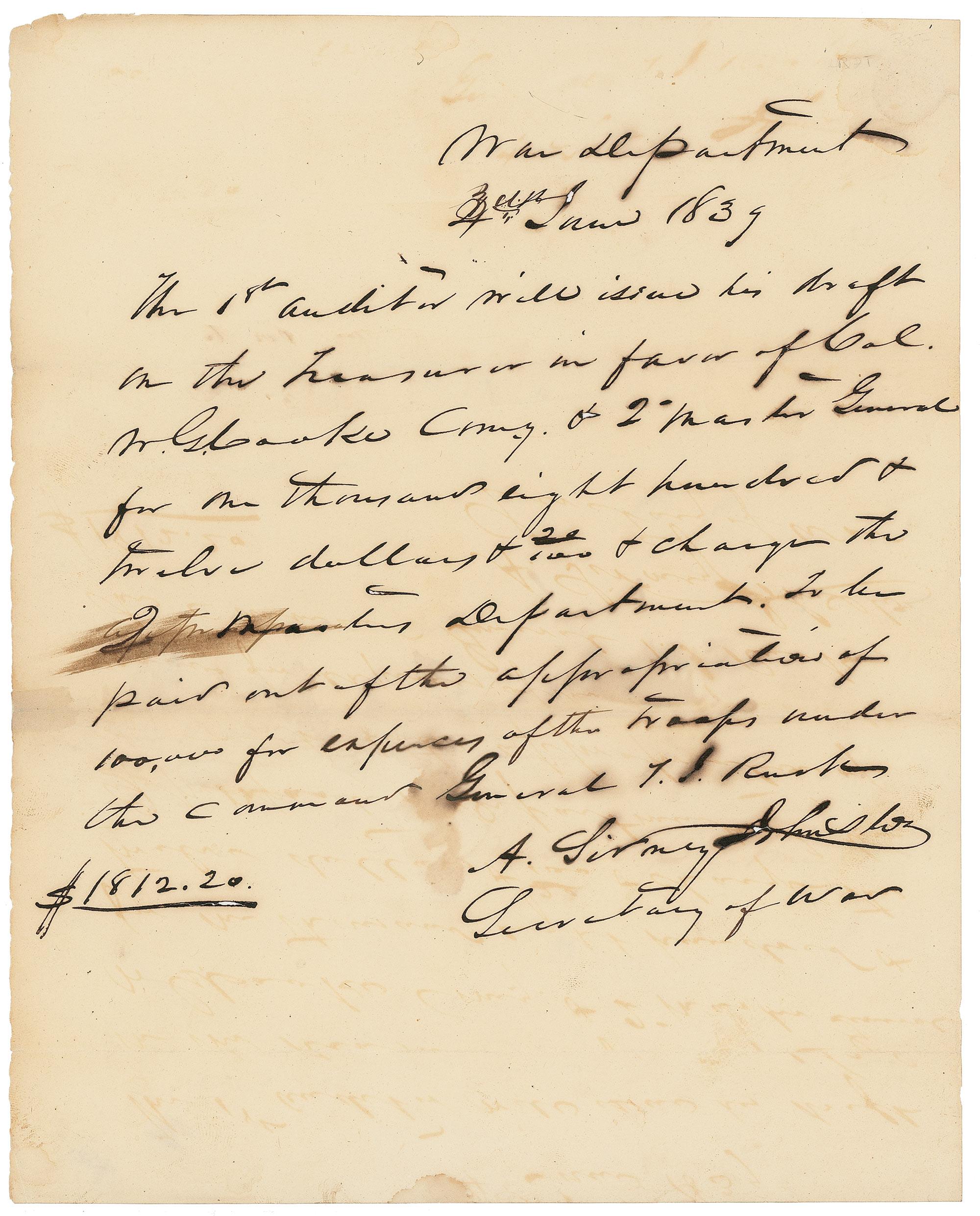 Confederate general, killed early in the war at the Battle of Shiloh. Johnston was considered by Jefferson Davis to be the finest general in the Confederacy. Very rare ADS, signed “A. Sidney Johnston, Secretary of War,” one page, 8 x 10, June 4, 1839. Document written in his hand while serving as Secretary of War for the Republic of Texas. In full, “The 1st auditor will issue his draft on the Treasurer in favor of Col. W. G. Cooke Comy. & Qr. Master General for one thousand eight hundred & twelve dollars & 20/100 & charge the Qr. Master’s Department. To be paid out of the appropriation of $100,000 for expenses of the troops under the command of General T. J. Rusk.” Johnston held his position as Secretary of War for less than two years, resigning his post in 1840. In very good condition, with several small areas of ink erosion, including one in last name of signature, several light brushes to text, light mirroring of ink from another document previously resting atop this one, and some light toning and a small circular impression to top right. Pre-certified John Reznikoff/PSA/DNA and RRAuction COA.