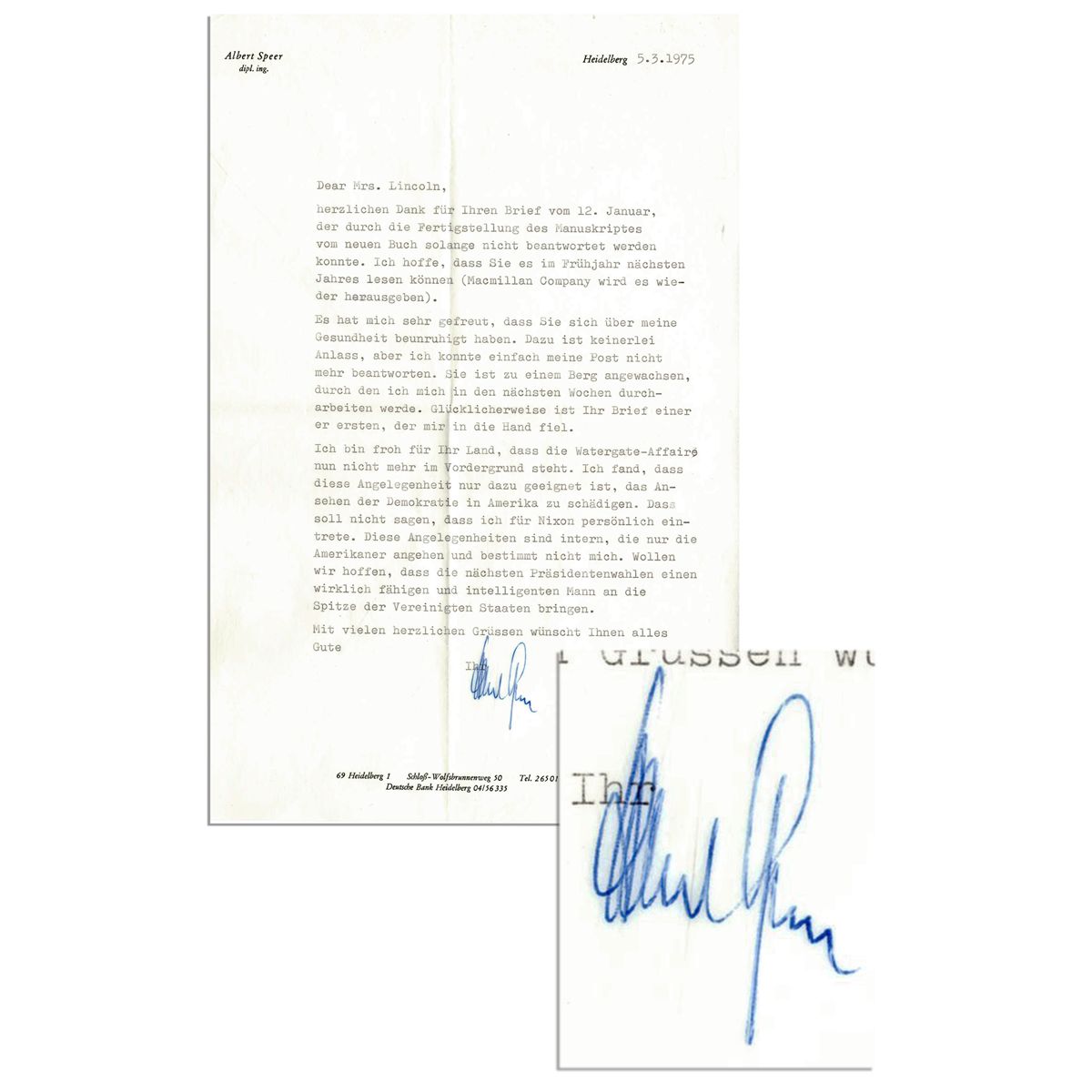 Former Nazi, Albert Speer typed letter signed, dated 5 March 1975. Speer mentions the Watergate scandal in this correspondence with American acquaintance Elaine Lincoln, ''...[in German] I'm very happy for your country that the Watergate affair is not in the foreground anymore. I found that this matter was only used to taint the image of the democracy of America. Which doesn't mean that I personally condone Nixon's actions. Such matters are internal, which only concern Americans and definitely not me...[signed] Albert Speer''. Folded document on Speer's personal letterhead measures 8.25'' x 11.5'', in near fine condition. Original envelope and full translation included.