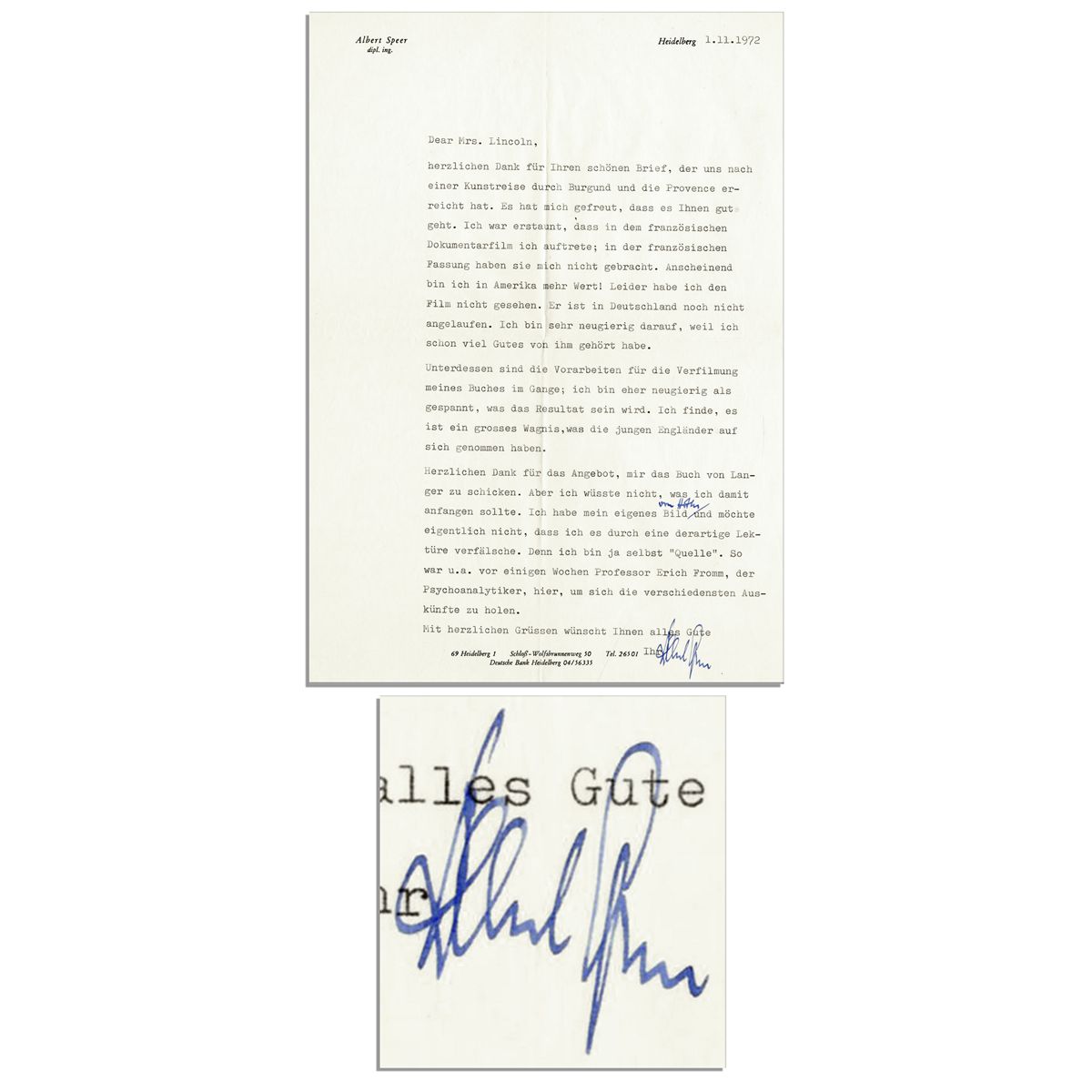 Former Nazi, Albert Speer typed letter signed, dated 1 November 1972. Speer writes of Hitler in this letter to American acquaintance Elaine Lincoln, in German: ''...many thanks for your offer to send me the book of Langer. I wouldn't know what to do with it; I have my own view [handwritten] of Hitler and don't want it to be altered through such a text, because I myself am a 'source'. Among others here a few weeks ago was Professor Erich Fromm the Psychoanalyst to collect information...[signed] Albert Speer''. Folded document on Speer's personal stationery measures 8.25'' x 11.5''. Lightly toned, else near fine condition. Original envelope and full translation included.