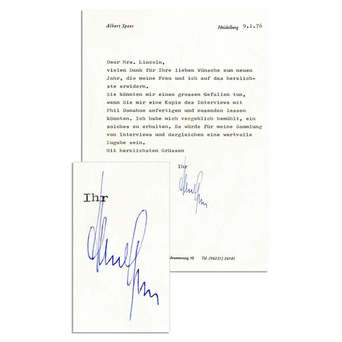Typed letter signed ''Albert Speer'' by the former Nazi. Just a few years before his death Speer writes to an American acquaintance, Elaine Lincoln. Dated 9 January 1976 on his personal stationery, the German letter reads in part: ''...You could do me a huge favor if you could make me a copy of the interview with Phil Donahue and send it to me. I have tried without success to acquire a copy. It would be a precious addition to my collection of interviews and such...'' 1pp. on card-style stationery measures 6'' x 8.25''. Creasing, else near fine. Accompanied by full translation.